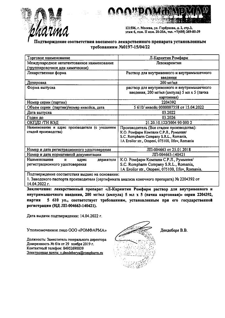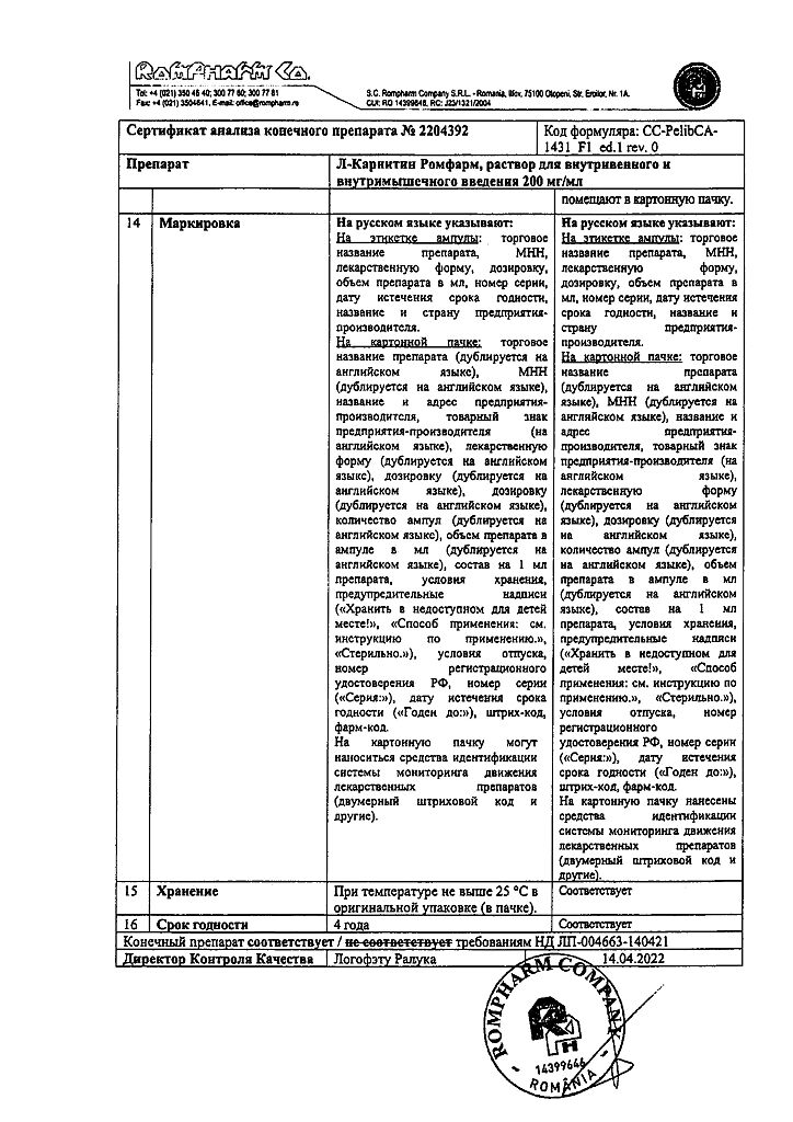 Л-Карнитин Ромфарм вводят внутривенно капельно медленно или струйно (2-3 мин) или внутримышечно. Перед внутривенным введением содержимое ампулы растворяют в 100-200 мл растворителя (0,9% раствор хлорида натрия или 5% раствор декстрозы (глюкозы)).