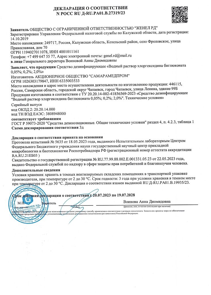 Средство дезинфицирующее «Водный раствор хлоргексидина биглюконата 0,05 %; 0,2 %; 2 %» предназначено для использования в лечебно-профилактических учреждениях (в том числе акушерско-гинекологического профиля, стоматологических, хирургических, кожно-венерологических, педиатрических учреждениях, фельдшерско-акушерских пунктах, станциях скорой медицинской помощи и т.д.), а также детских учреждениях, объектах коммунально-бытовой сферы, на предприятиях фармацевтической и биотехнологической промышленности, в салонах красоты, учреждениях образования, социального обеспечения, культуры, отдыха и спорта, для работников дезинфекционных станций и в других учреждениях, занимающихся дезинфекционной деятельностью.