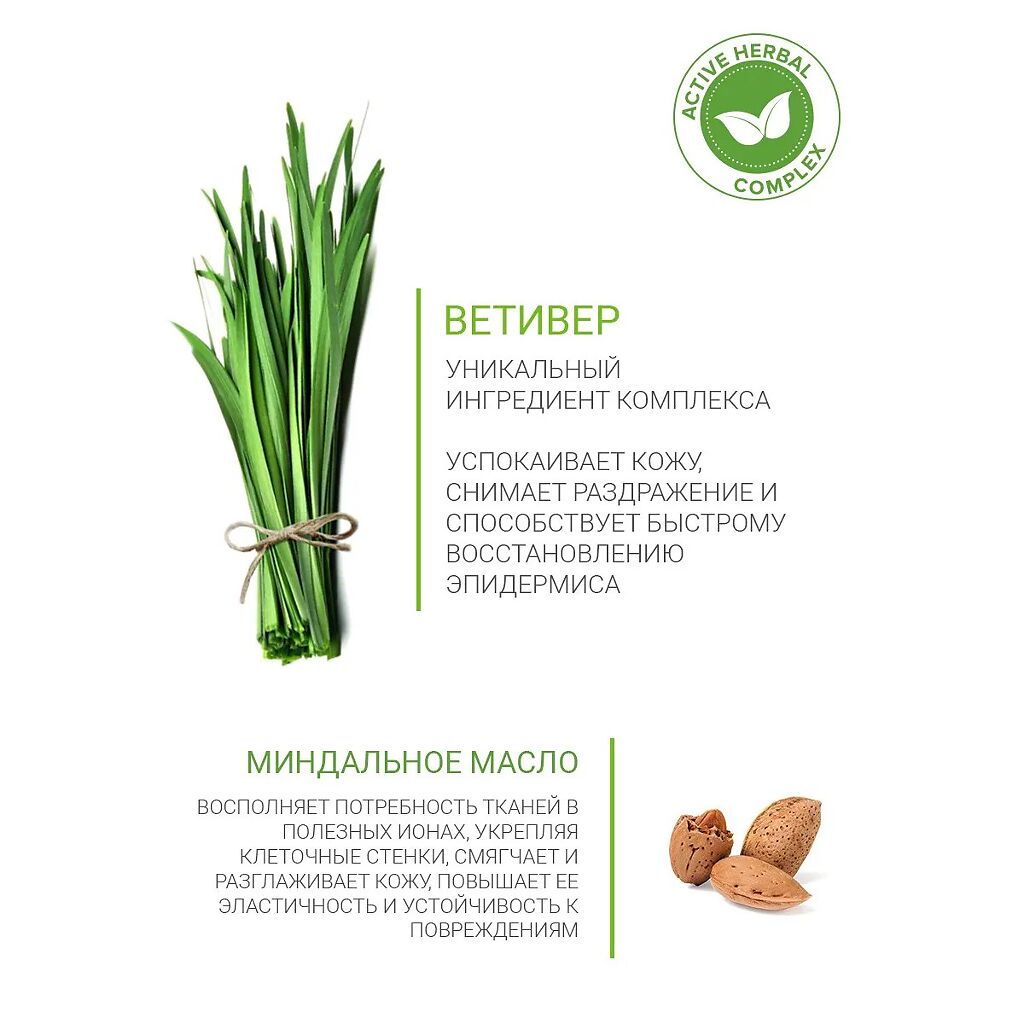 Комплекс активных природных ингредиентов: ветивер, миндальное, оливковое, кокум масло и масло ростков пшеницы, экстракт базилика, лакрицы, нима и гедихиума; глицерин, витамин E. Без парабенов.