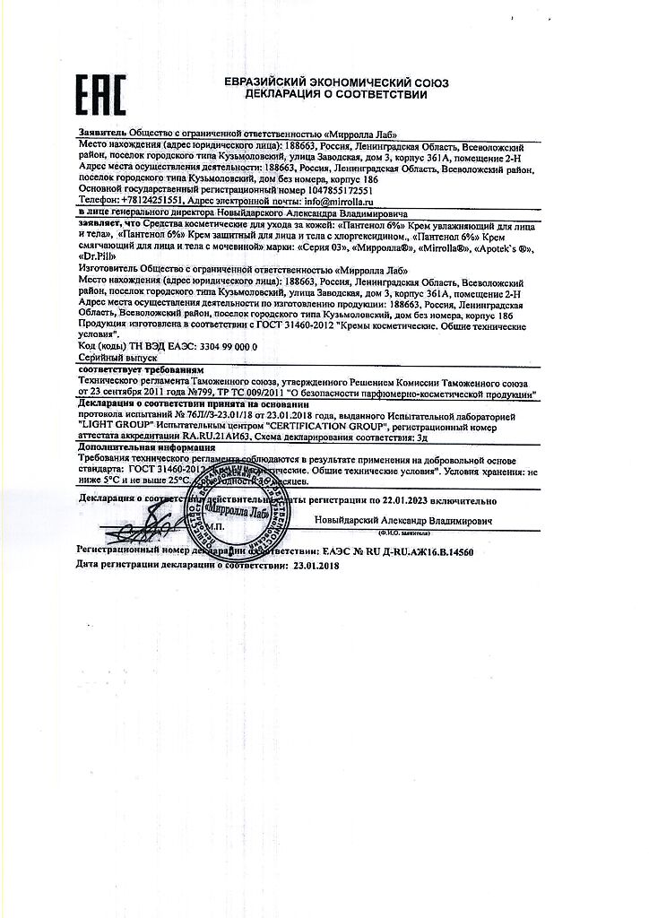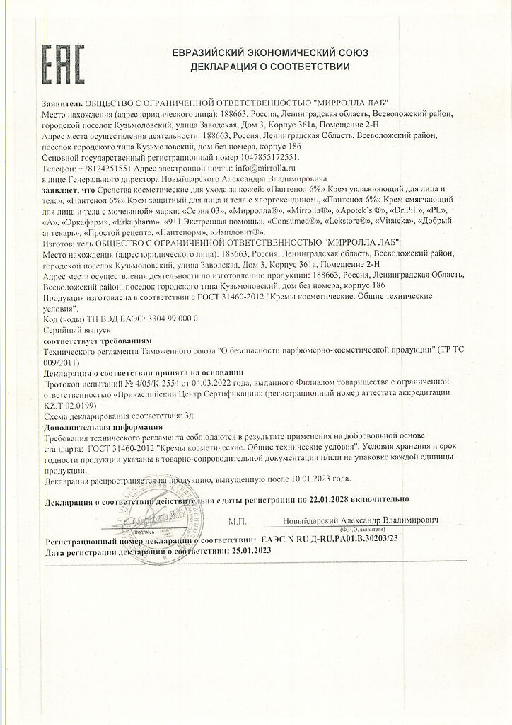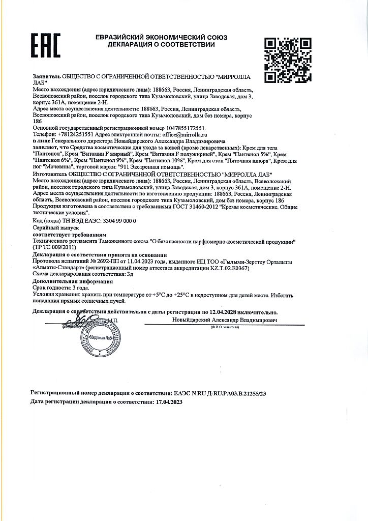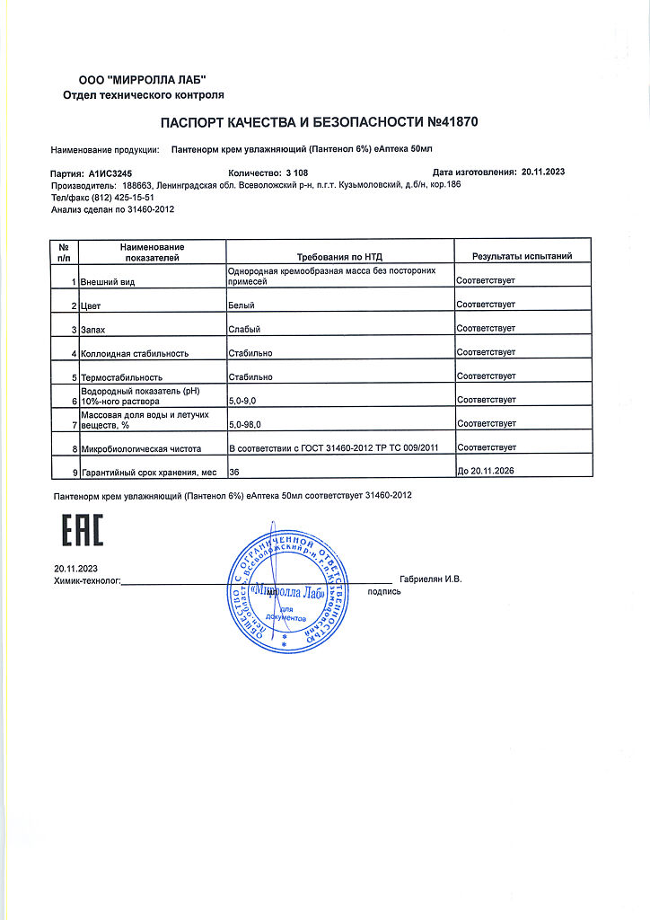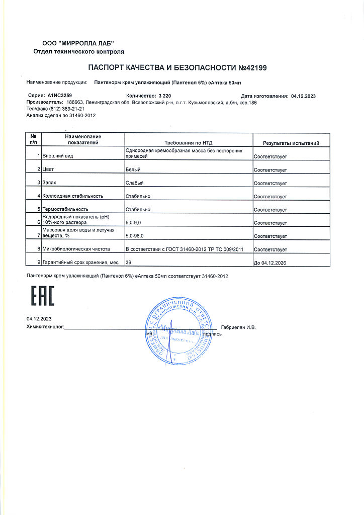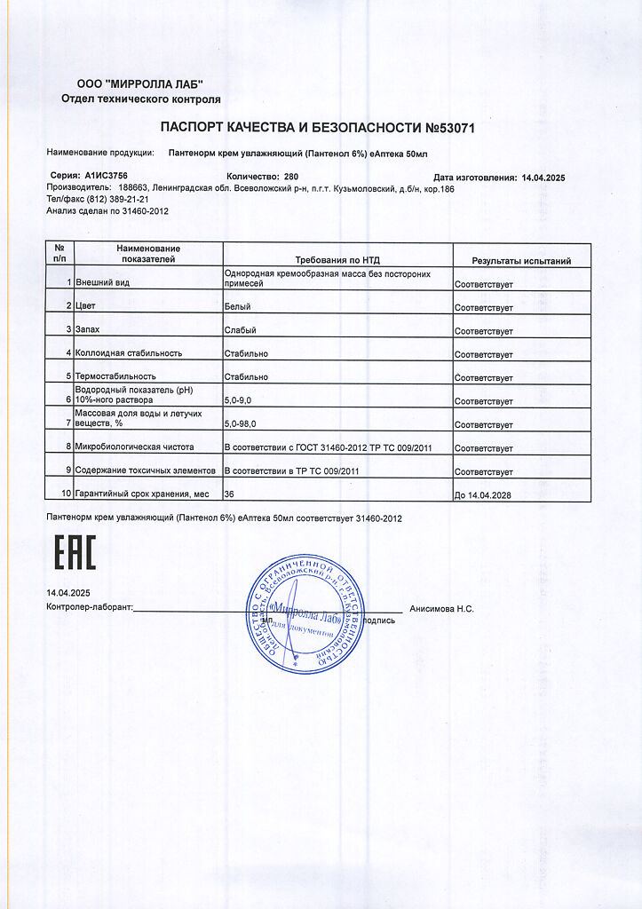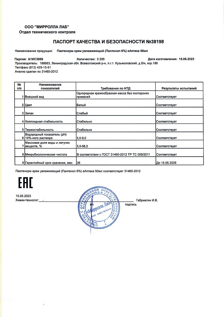 Aqua, Panthenol (Пантенол), Cetearyl Alcohol, Lanolin, Potassium Cetyl Phosphate, Pentylene  Glycol, Carbomer, Triethanolamine, EDTA, Phenoxyethanol, Ethylhexylglycerin.