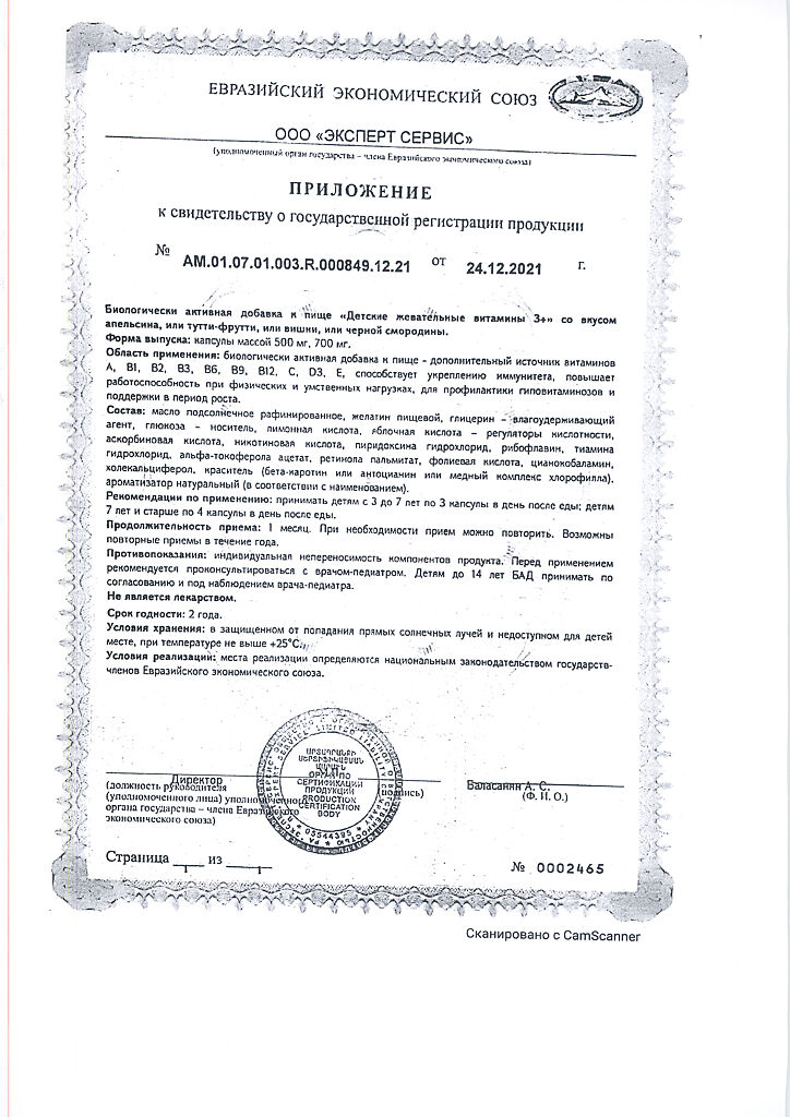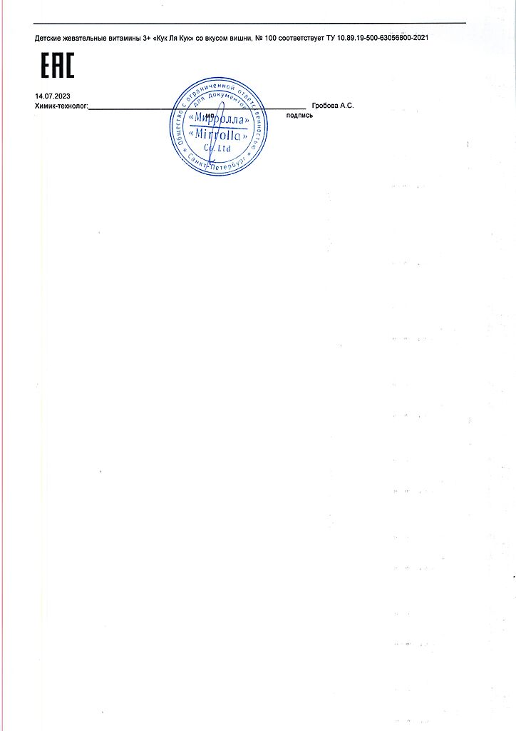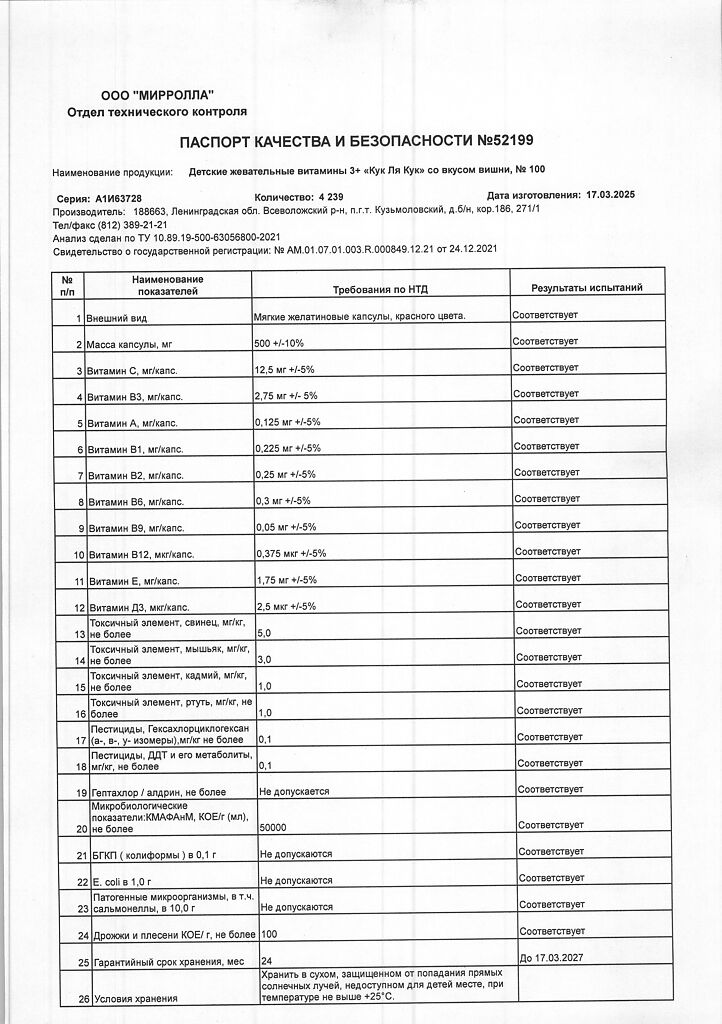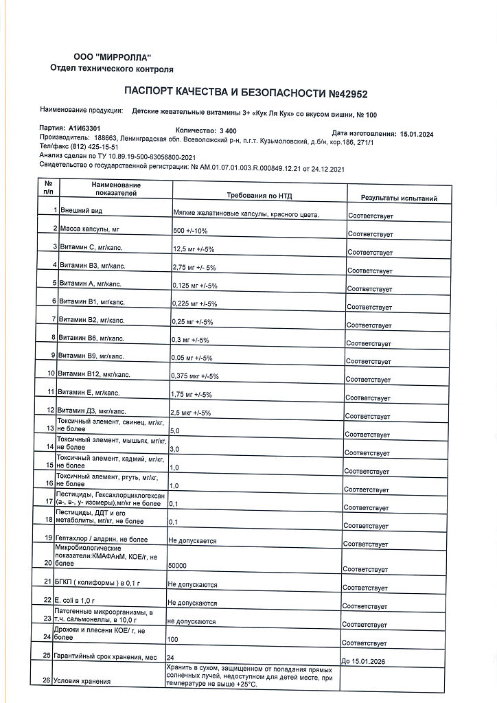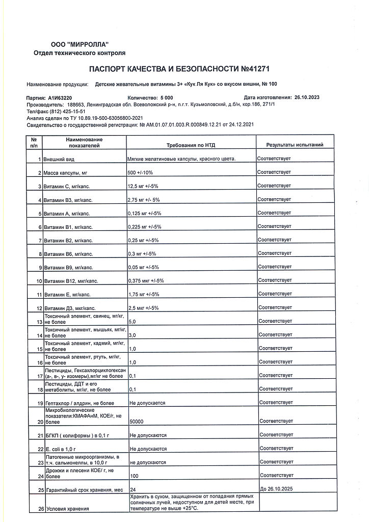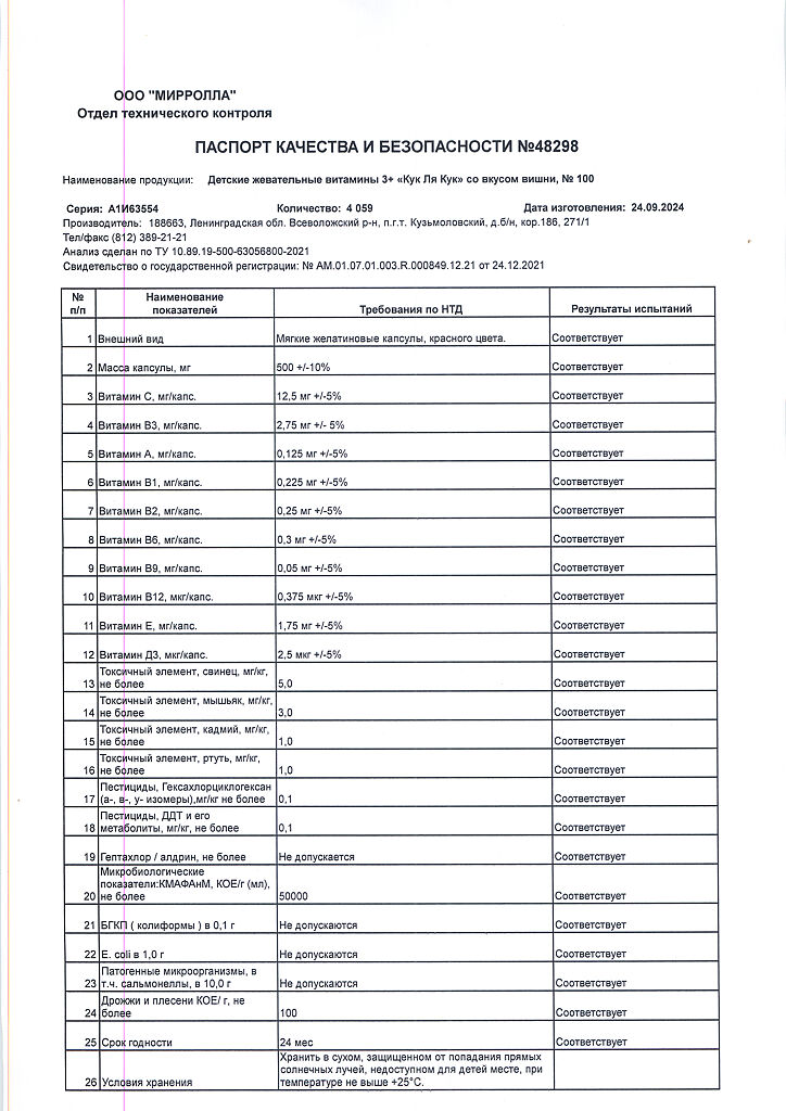 Документы Кук Ля Кук Детские жевательные витамины 3+ капсулы массой 500 мг со вкусом вишни 100 шт