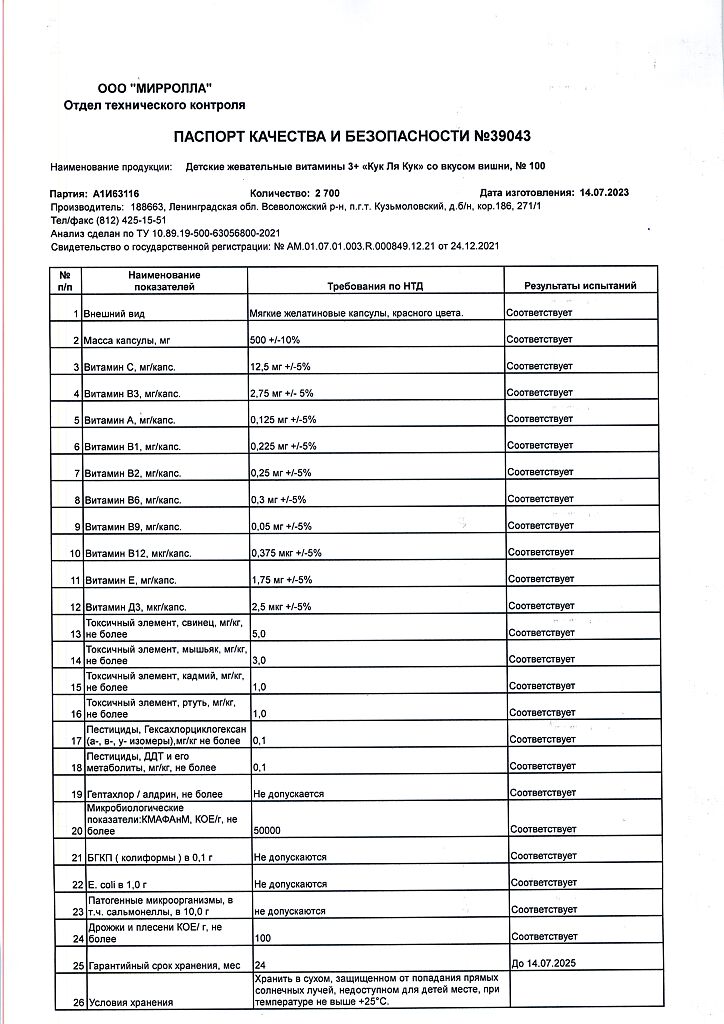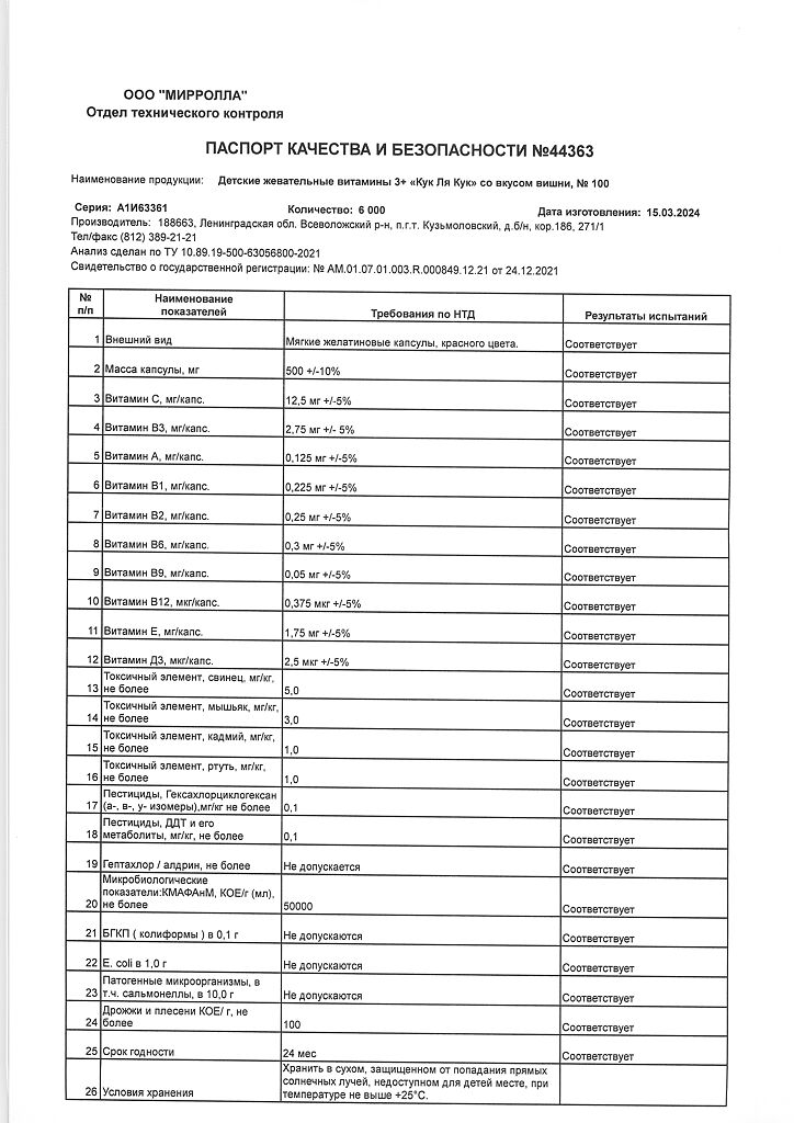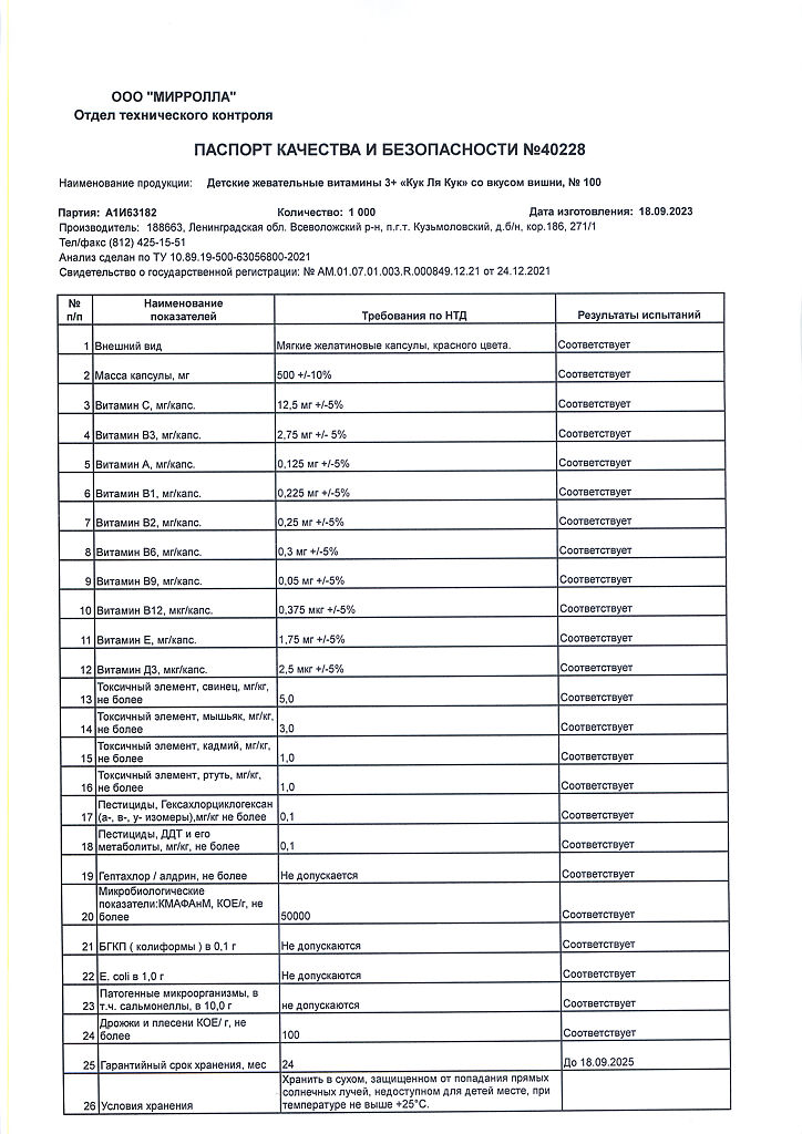 • 📒 Подробная инструкция по применению Кук Ля Кук Детские жевательные витамины 3+ капсулы массой 500 мг со вкусом вишни 100 шт
