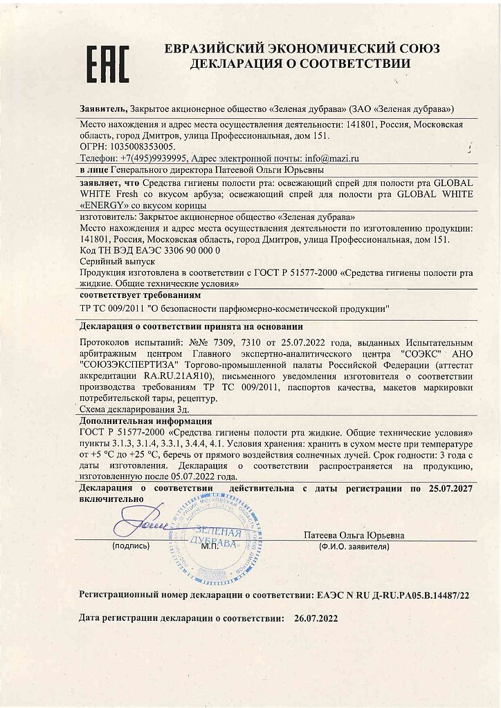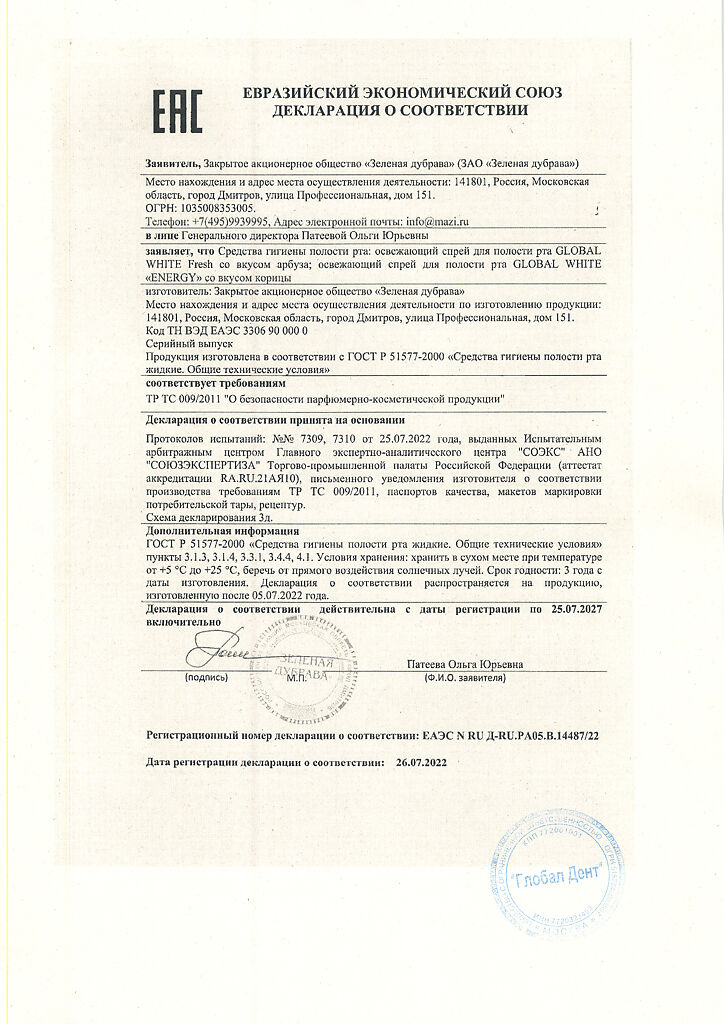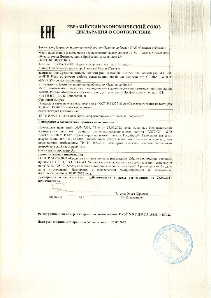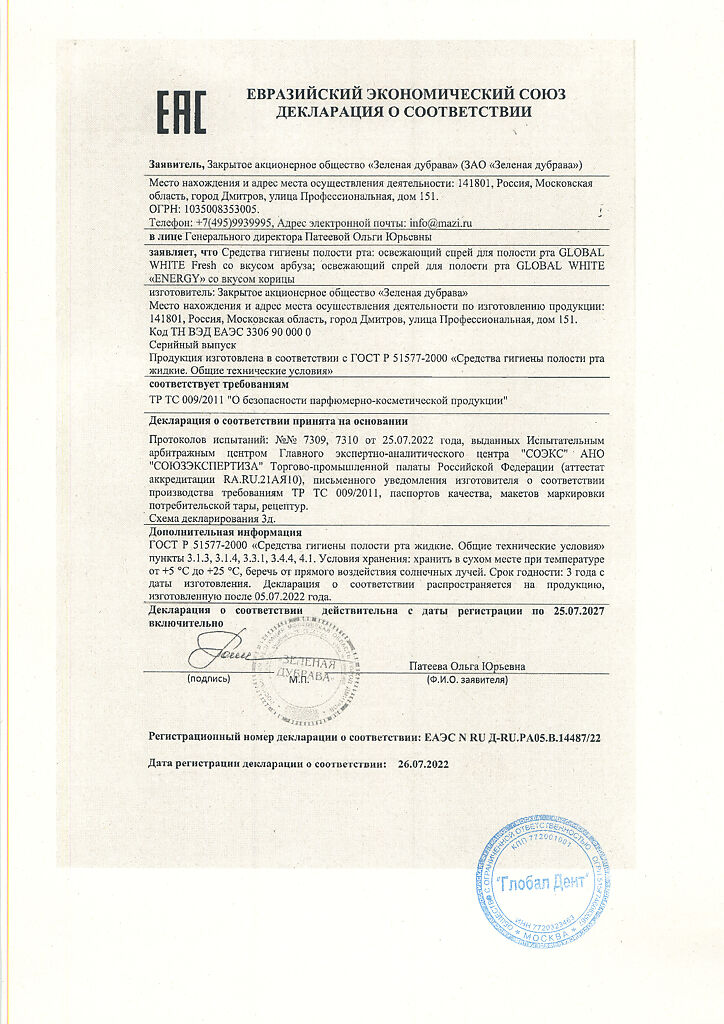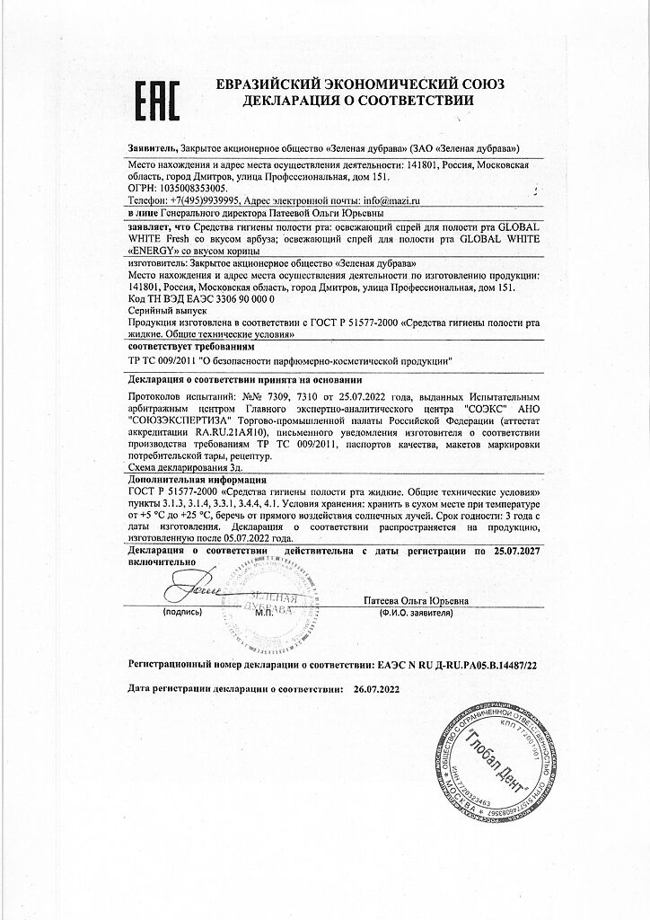 • 📒 Подробная инструкция по применению Global White Спрей освежающий Fresh для полости рта со вкусом арбуза 15 мл 1 шт