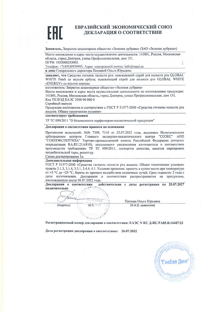 Освежающий спрей GLOBAL WHITE со вкусом арбуза - это компактный и удобный аксессуар в картонной коробке. Мы отказались от блистеров, чтобы сократить количество палстиковой упаковки. Это 60 тысяч штук в год. Меньше пластика - разве это не фантастика?