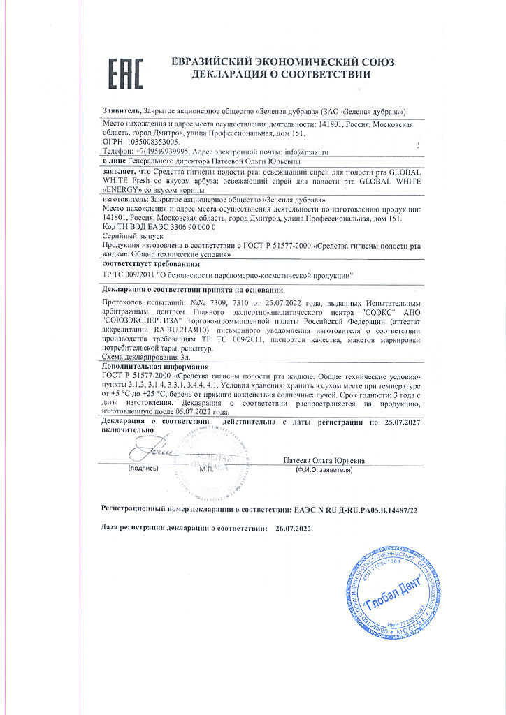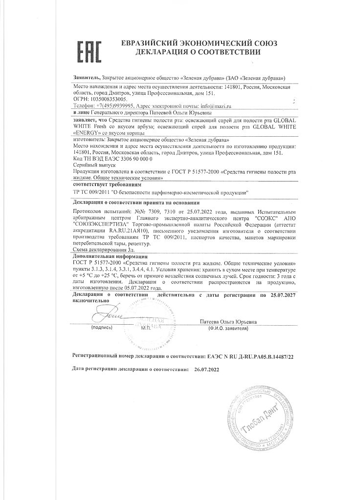 Документы Global White Спрей освежающий Fresh для полости рта со вкусом арбуза 15 мл 1 шт