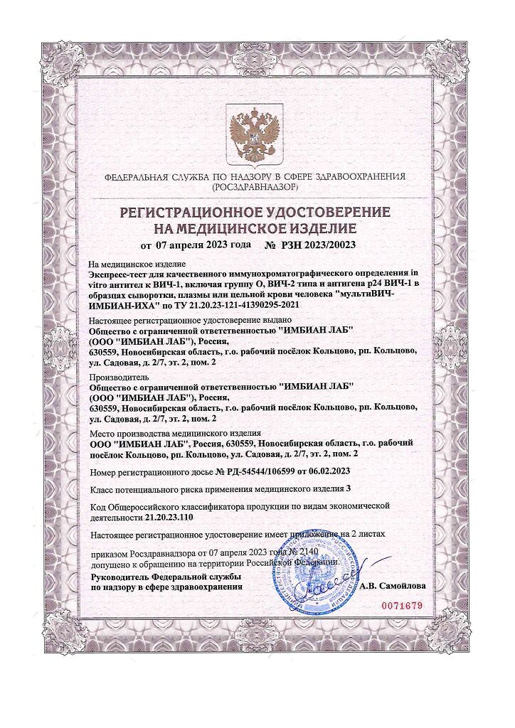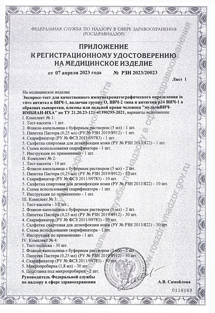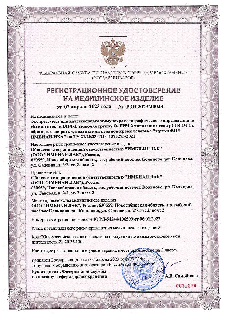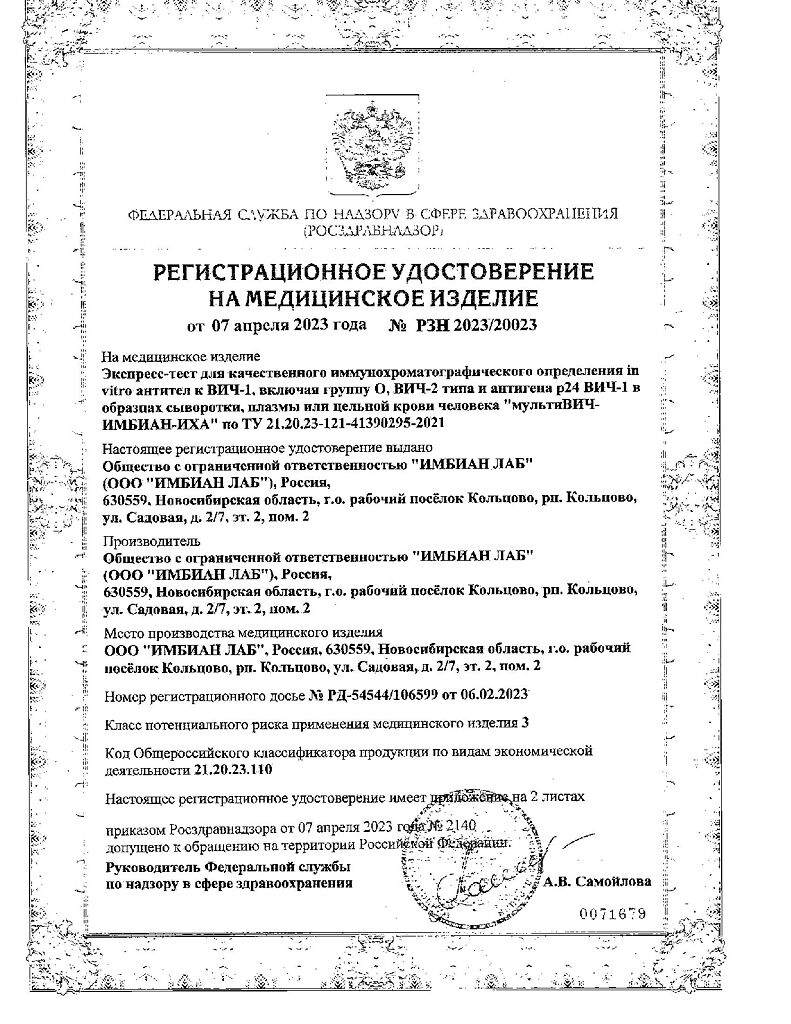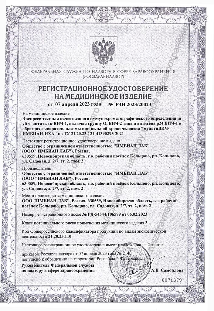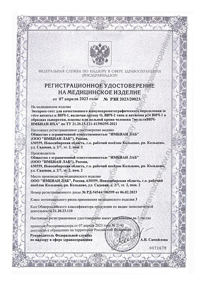 Экспресс-тест для качественного иммунохроматографического определения in vitro антител к ВИЧ-1, включая группу О, ВИЧ-2 типа и антигена р24 ВИЧ-1 в образцах сыворотки, плазмы или цельной крови человека «мультиВИЧ-ИМБИАН-ИХА»