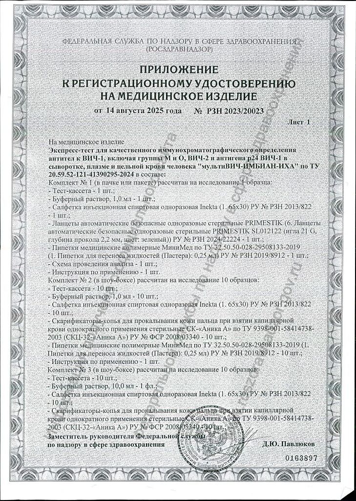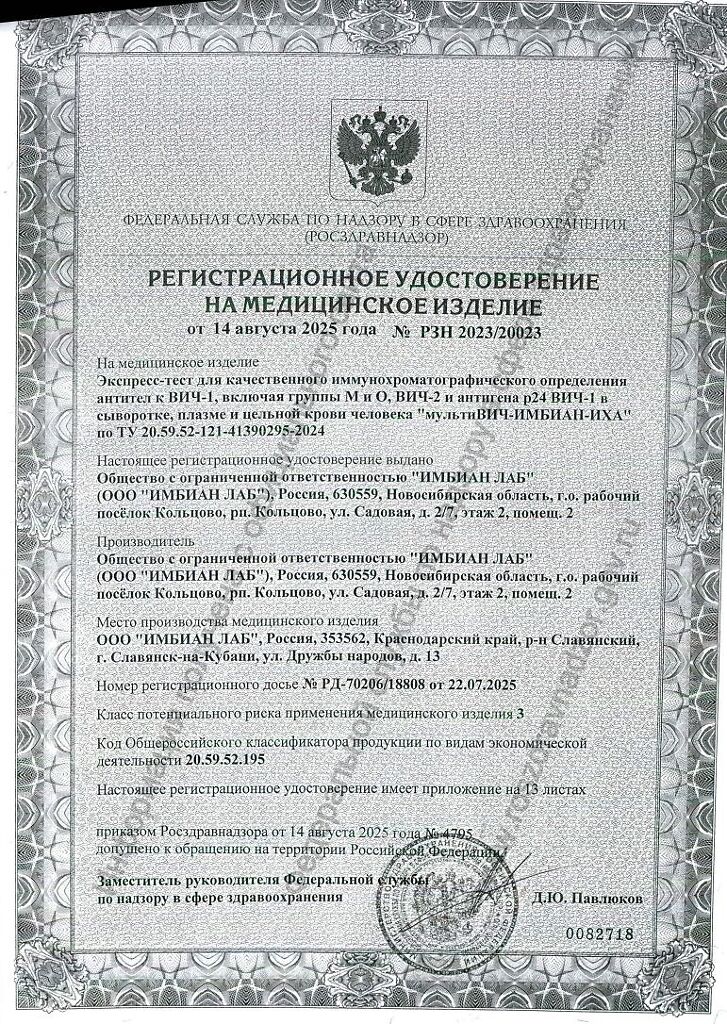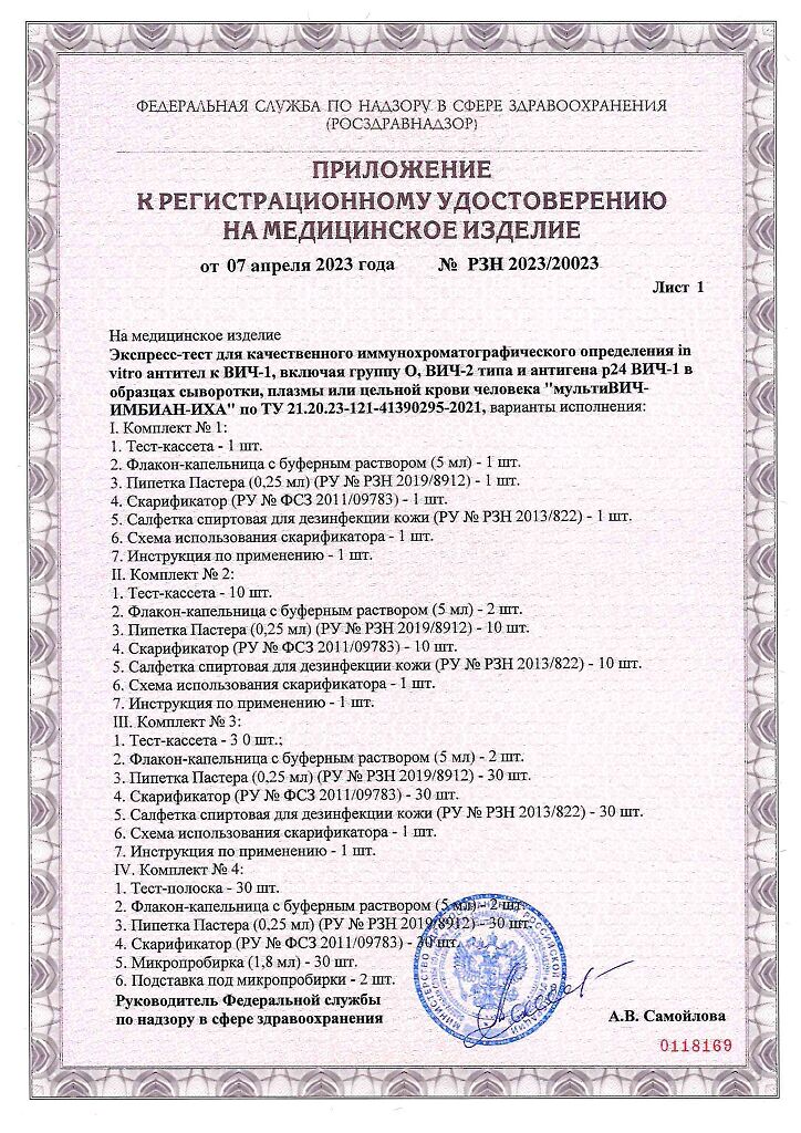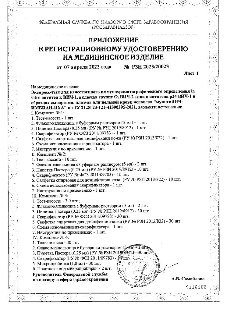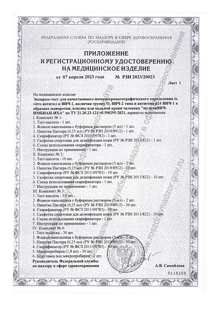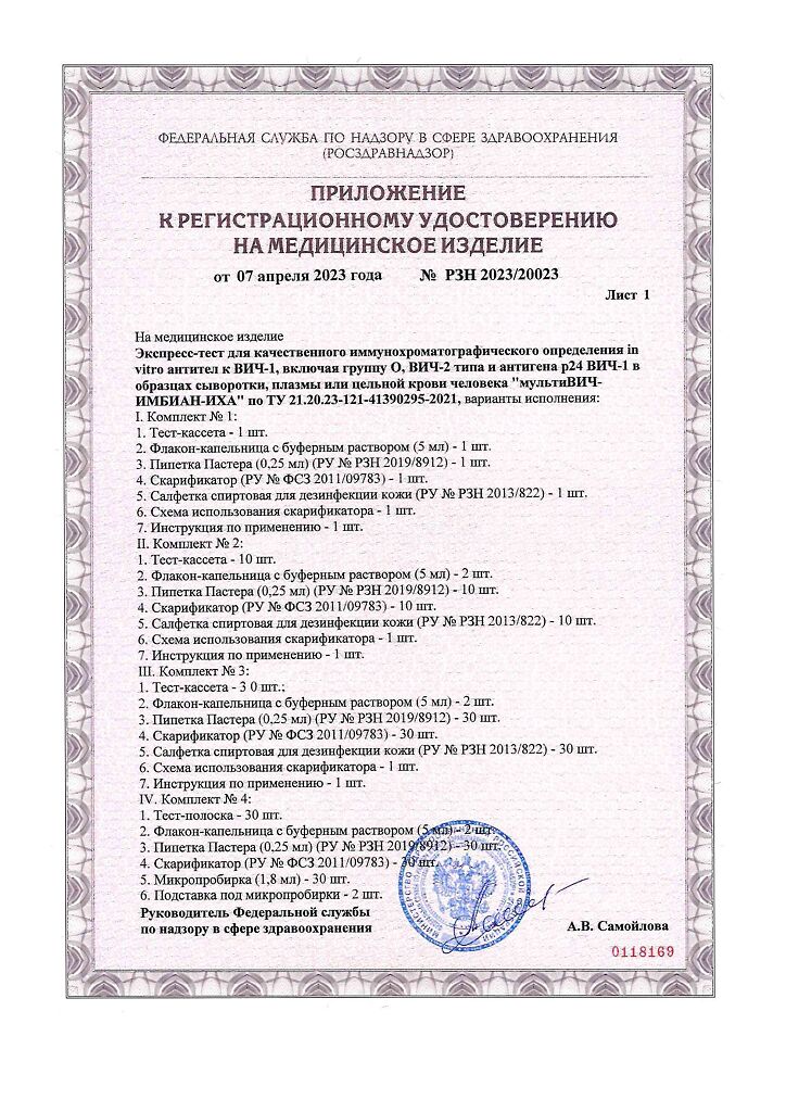 Экспресс-тест для качественного иммунохроматографического определения in vitro антител к ВИЧ-1, включая группу О, ВИЧ-2 типа и антигена р24 ВИЧ-1 в образцах сыворотки, плазмы или цельной крови человека «мультиВИЧ-ИМБИАН-ИХА»