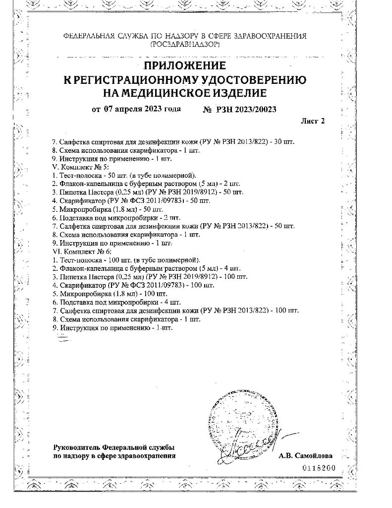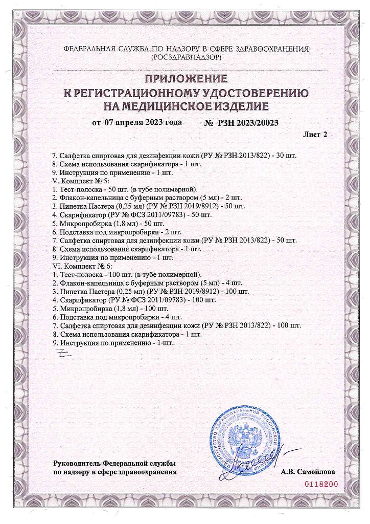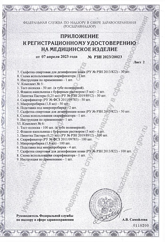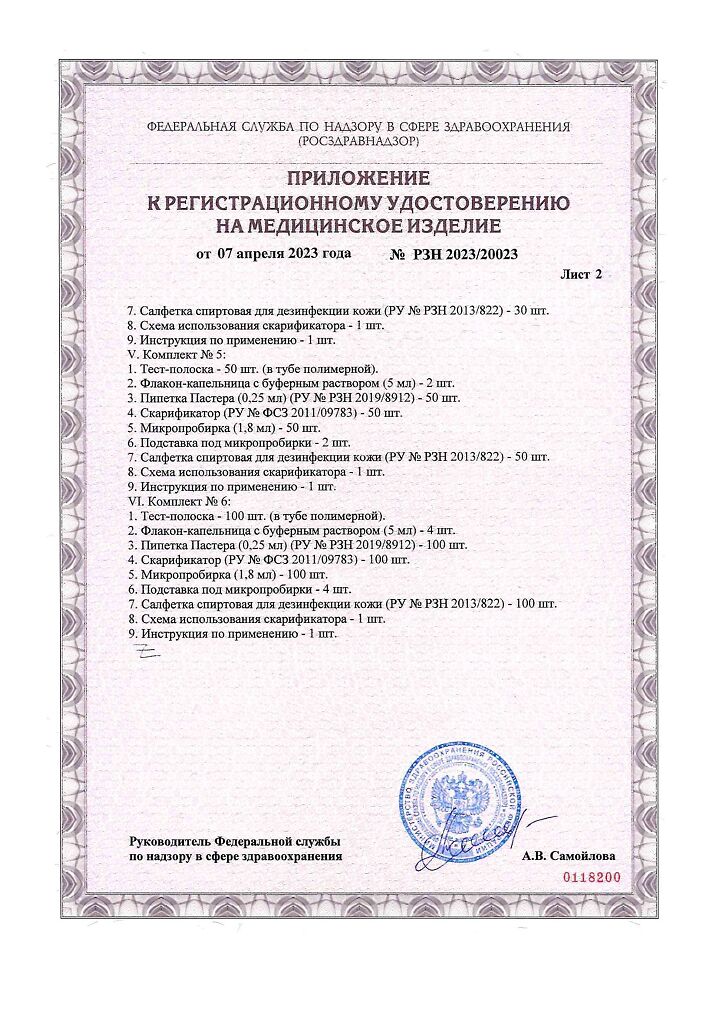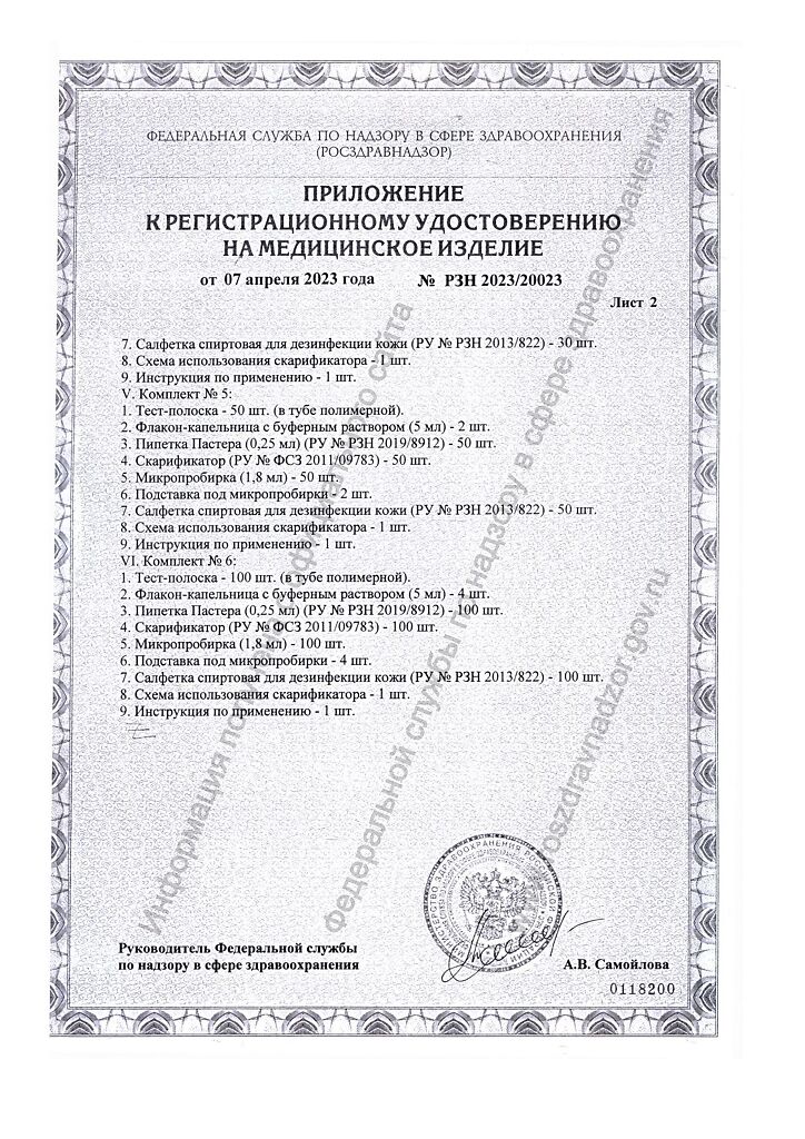 Пачка карт. индивидуальная, инструкция по применению- 1шт; салфетка спиртовая- 1шт.; тест-кассета 1 шт.; -флакон-капельница с буферным раствором (5 мл) – -1 шт., одноразовая пипетка- 1шт, -скарификатор 1 шт; схема использования скарификатора- 1шт