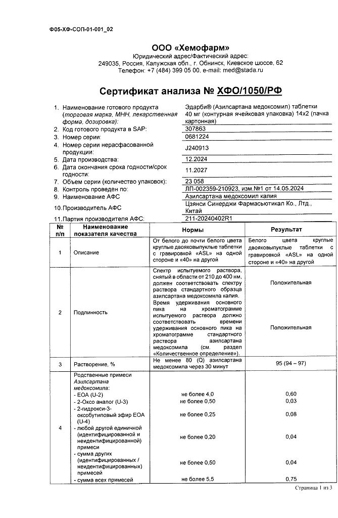 Безопасность и эффективность применения препарата не зависят от возраста пациентов, но большая чувствительность к снижению АД у некоторых пожилых пациентов не может быть исключена. Как и при применении других антагонистов рецепторов ангиотензина II и ингибиторов ангиотензинпревращающего фермента (АПФ), антигипертензивный эффект менее выражен у пациентов негроидной расы (обычно популяция с низкой активностью ренина в плазме крови). Одновременное применение Эдарби® 40 мг и 80 мг с дигидропиридиновыми блокаторами «медленных» кальциевых каналов (амлодипин) или тиазидными диуретиками (хлорталидон) приводит к дополнительному снижению АД по сравнению с гипотензивными средствами, применяемых в монотерапии (см. раздел Взаимодействие с другими лекарственными средствами).