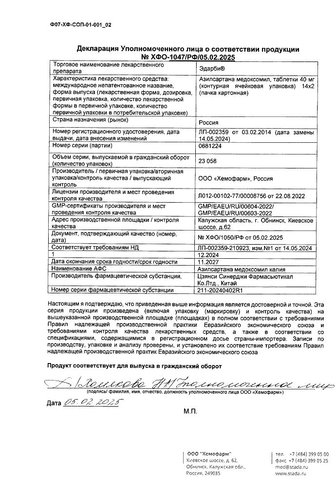 В случае неадекватного контроля АД в монотерапии препаратом Эдарби® возможно его одновременное применение с другими гипотензивными средствами, включая диуретики (хлорталидон и гидрохлоротиазид) и дигидропиридиновые блокаторы «медленных» кальциевых каналов (амлодипин).