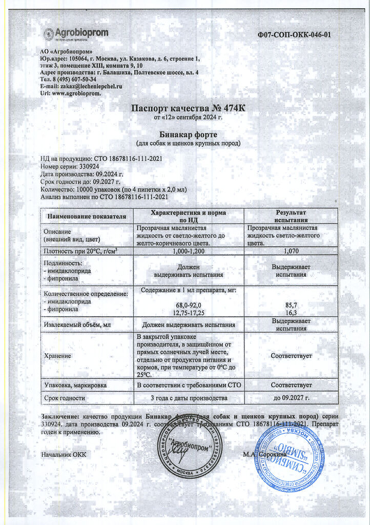 Лекарственный препарат Бинакар Форте в 1 мл в качестве действующих веществ содержит: имидаклоприд - 80 мг, фипронил - 15 мг и вспомогательные вещества.