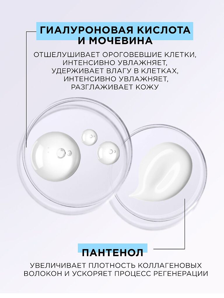 • Мочевина мягко отшелушивает ороговевшие клетки, интенсивно увлажняет и удерживает влагу в клетках;