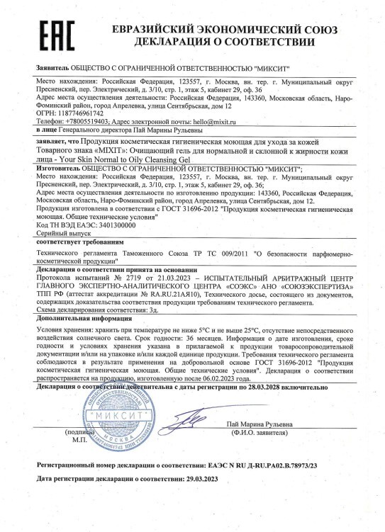 Документы Mixit Your Skin Очищающий гель для жирной кожи лица Cleansing Gel for Oily Skin 150 мл 1 шт