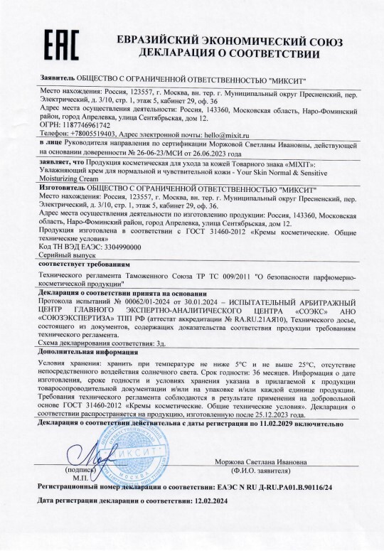 Документы Mixit Your Skin Увлажняющий крем для нормальной и чувствительной кожи 50 мл 1 шт
