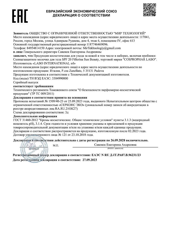 Документы Филлерина/Fillerina Sun Beauty Солнцезащитное молочко для тела SPF20 150 мл 1 шт