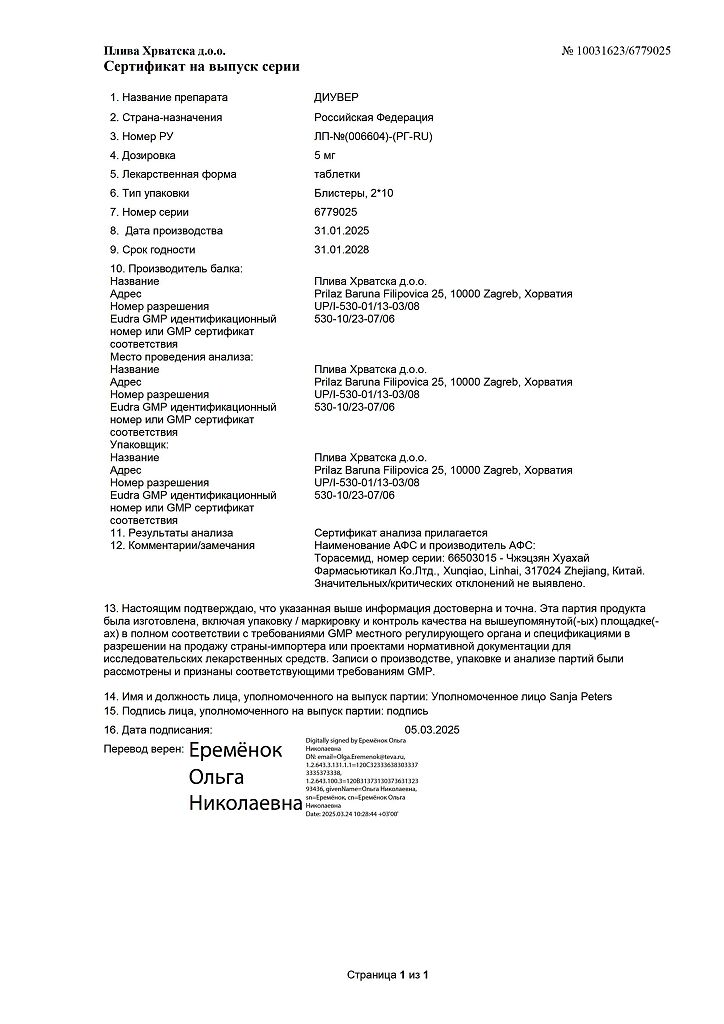 Действующее вещество: Торасемид