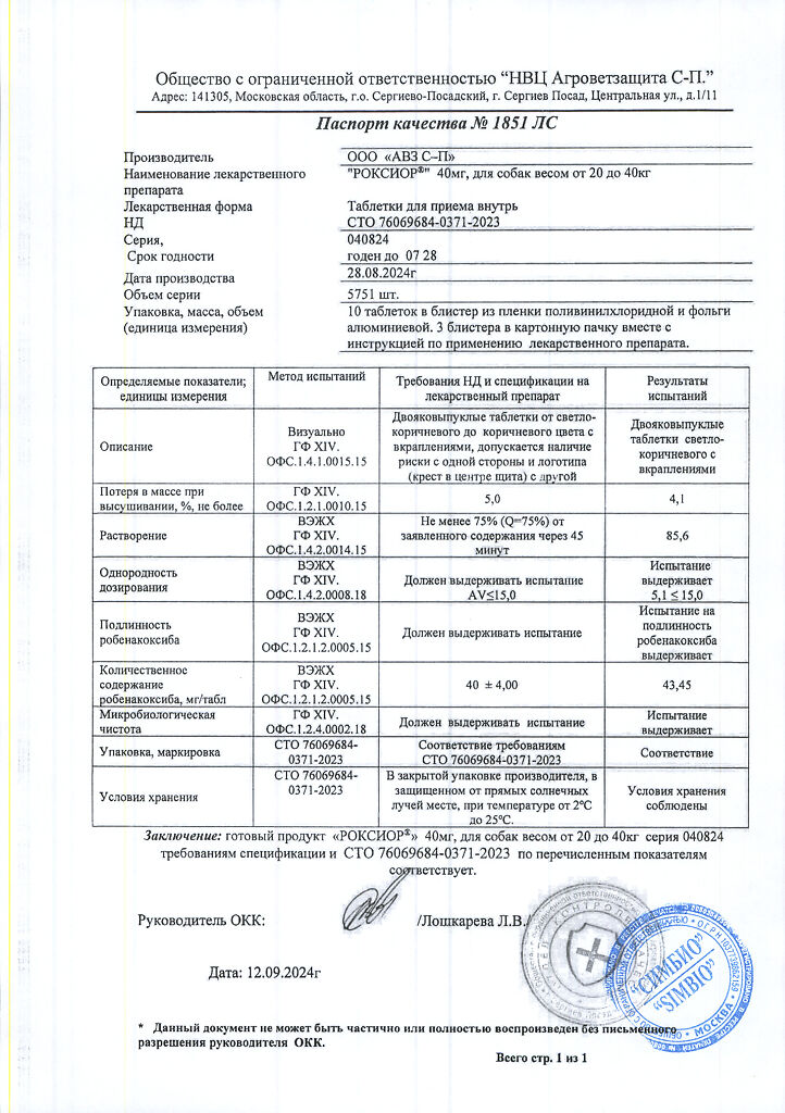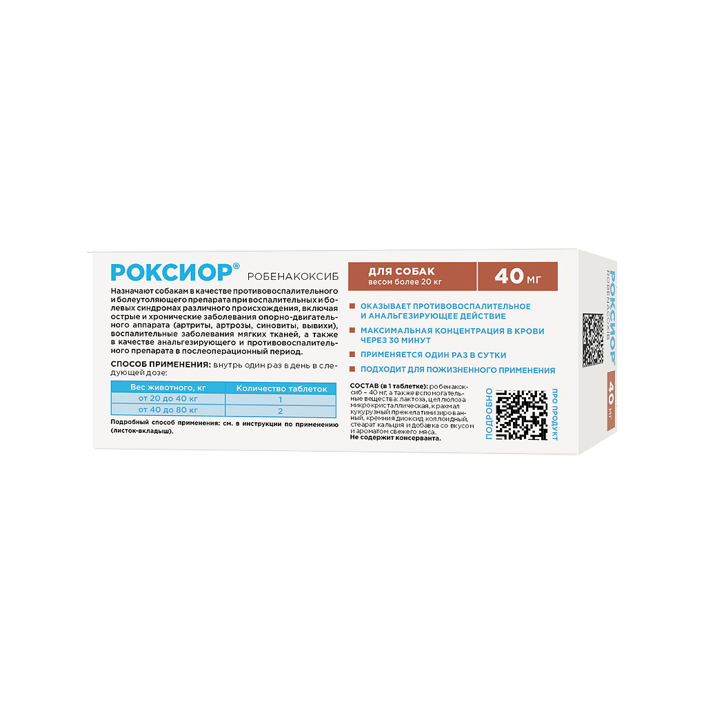 Лекарственный препарат РОКСИОР® для собак выпускают в 4 дозировках с содержанием робенакоксиба: 5 мг/табл., 10 мг/ табл., 20 мг/табл. 40 мг/табл. соответственно.