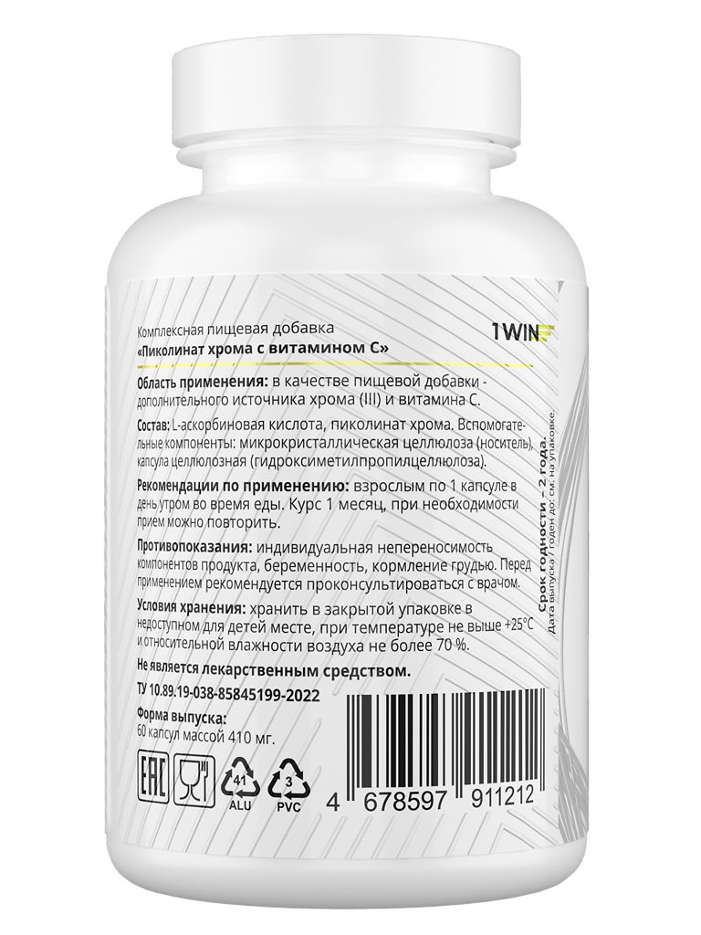 1WIN Хрома пиколинат + витамин С / Chromium picolinate + vitamin C капсулы массой 410 мг 60 шт: отзывы покупателей и фармацевтов