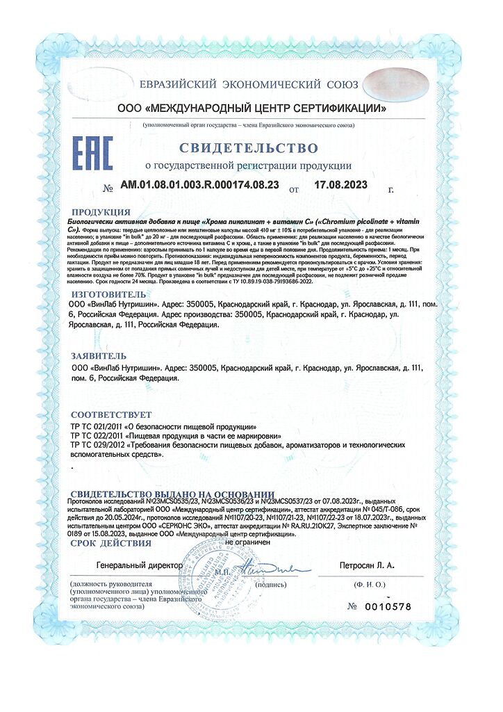 Документы 1WIN Хрома пиколинат + витамин С / Chromium picolinate + vitamin C капсулы массой 410 мг 60 шт