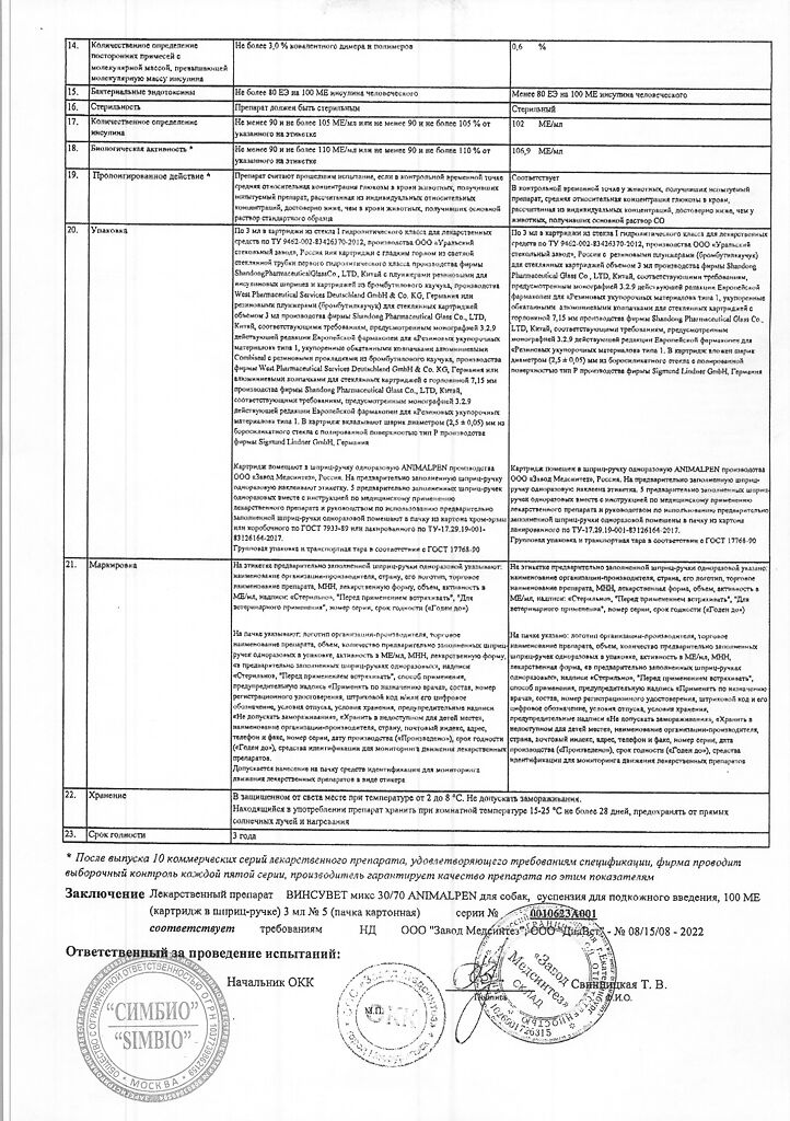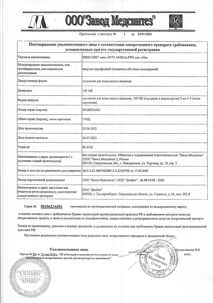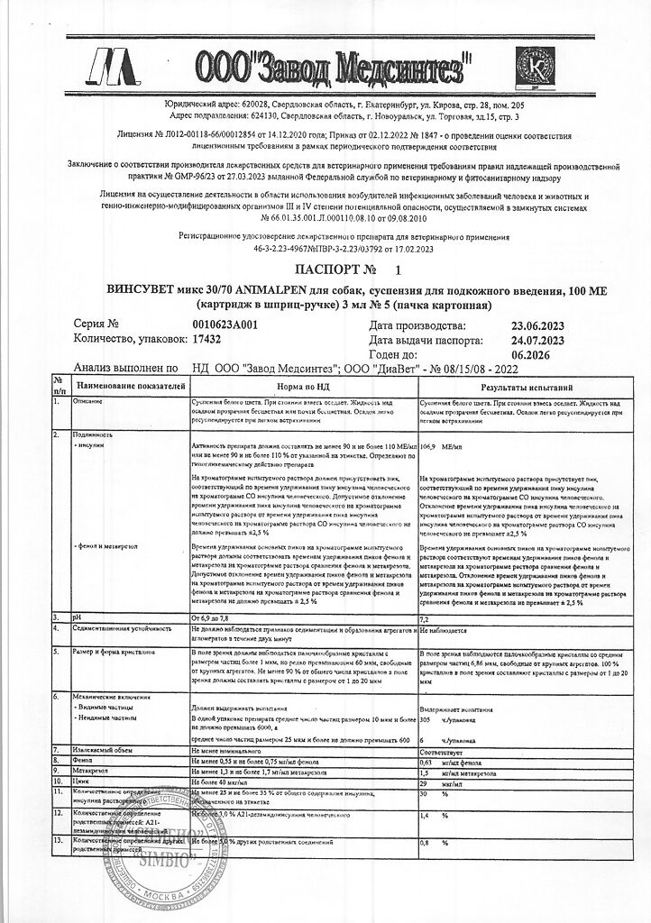 ВИНСУВЕТ микс 30/70 ANIMALPEN для собак содержит в 1 мл в качестве действующего вещества инсулин двухфазный [человеческий генно-инженерный] 100 МЕ (инсулин двухфазный содержит 30 МЕ раствора инсулина человеческого растворимого и 70 МЕ суспензии инсулина изофана человеческого).