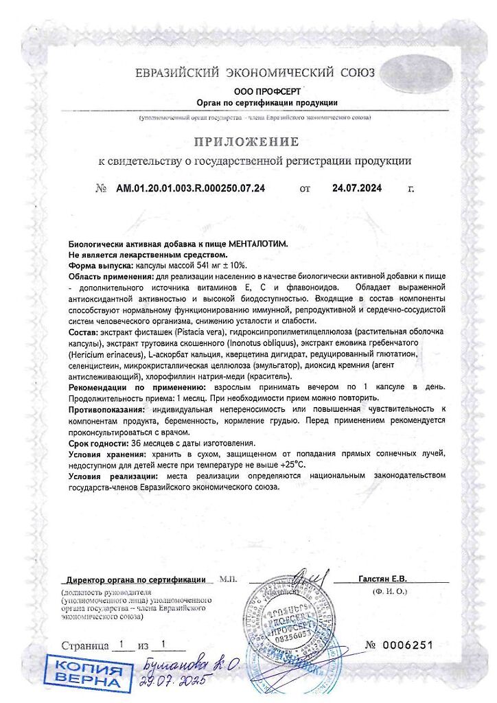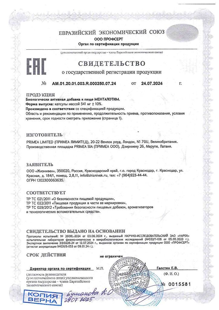 Документы Жизнивек Менталотим капсулы массой 541 мг 30 шт