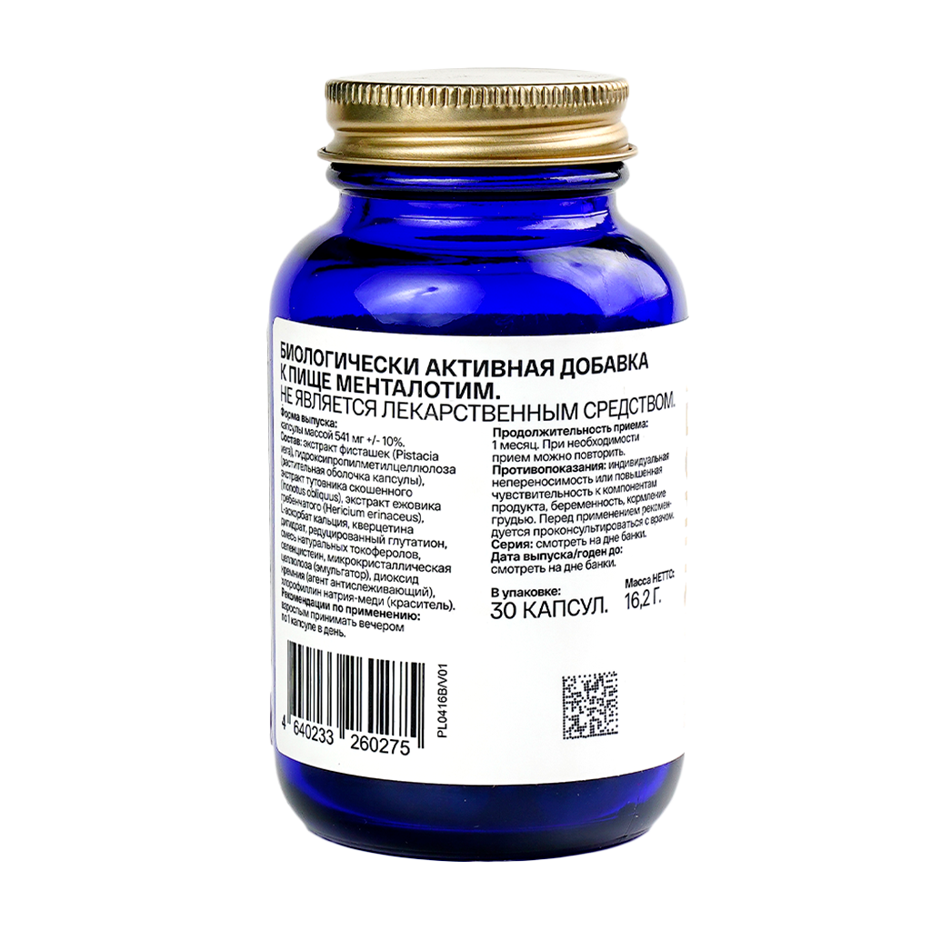 Экстракт фисташек (Pistacia vera), гидроксипропилметилцеллюлоза (растительная оболочка капсулы), экстракт тутовника скошенного (Inonotus obliquus), экстракт ежовика гребенчатого (Hericium erinaceus), L-аскорбат кальция, кверцетина дигидрат, редуцированный глутатион, смесь натуральных токоферолов,селенцистеин, микрокристаллическая целлюлоза (эмульгатор), диоксид кремния (агент антислеживающий), хлорофиллин натрия-меди (краситель).