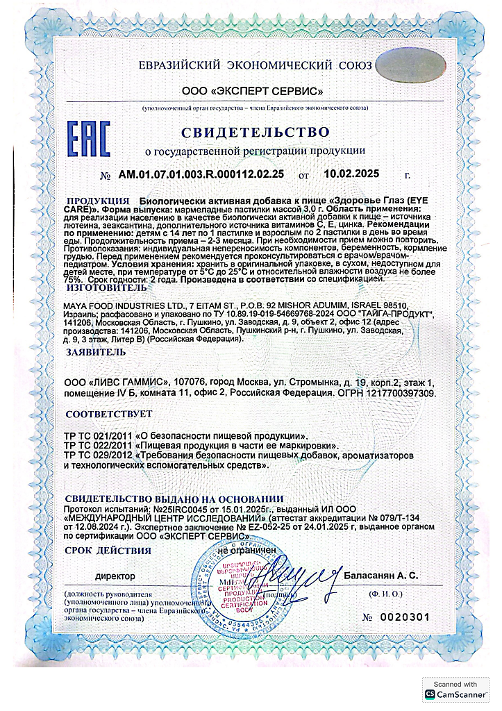 Документы LIVS Здоровье Глаз / Eye Care мармеладные пастилки массой 3,0 г 60 шт