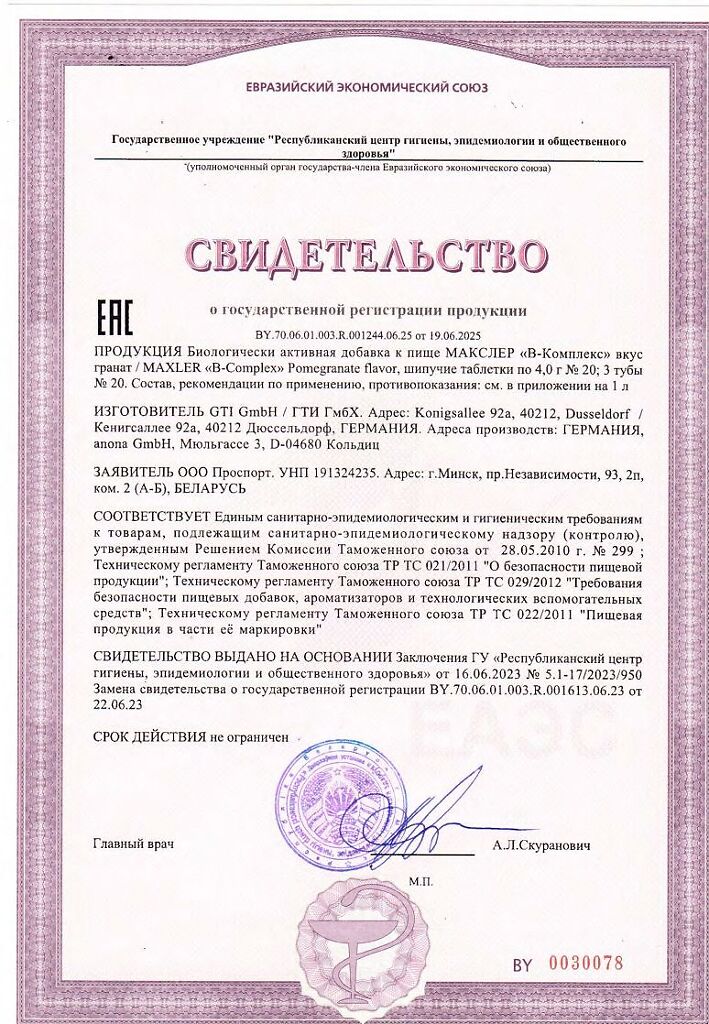 Документы Макслер В-комплекс вкус грант / Maxler B-Complex Pomegranate flavor шипучие таблетки по 4,0 г 20 шт