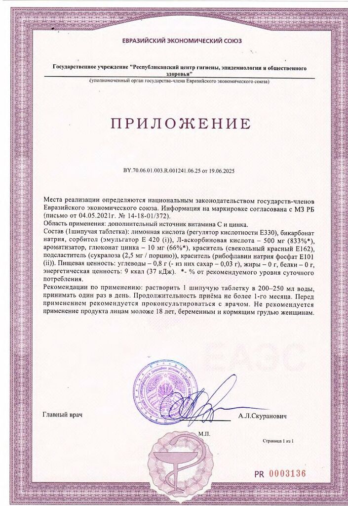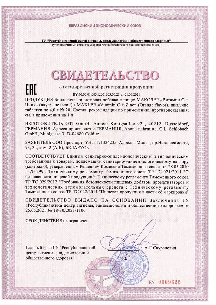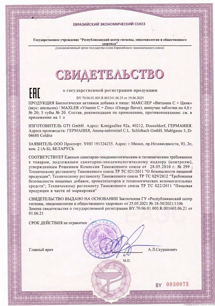 Документы Макслер Витамин С + Цинк вкус апельсин / Maxler Vitamin C + Zinc Orange flavor шипучие таблетки по 4,0 г туба 20 шт