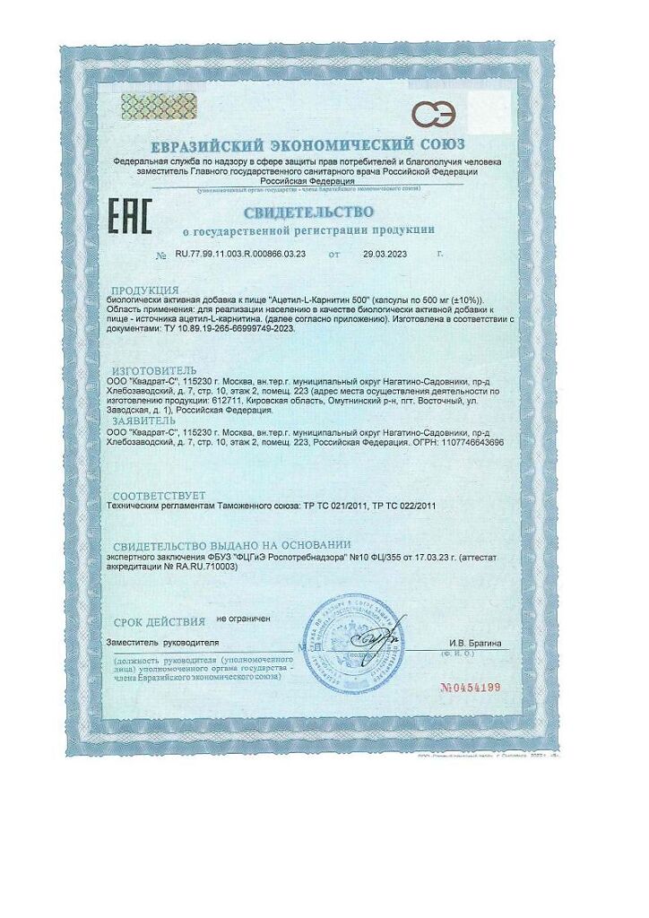Документы Tetralab Ацетил-L-Карнитин 500 капсулы по 500 мг 60 шт