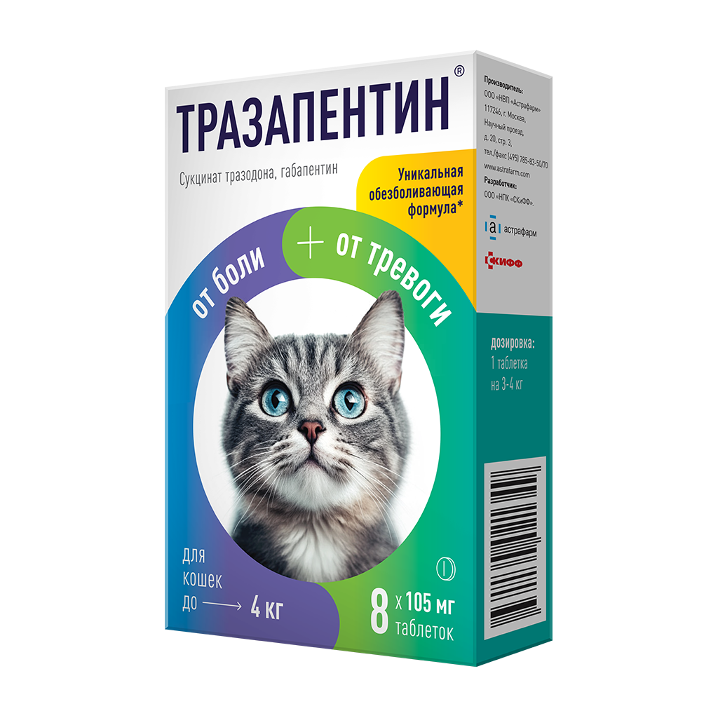 -Тразапентин таблетки для кошек до 4 кг (масса таблетки 105 мг) 36 мг габапентина и 12 мг сукцината тразодона на таблетку;