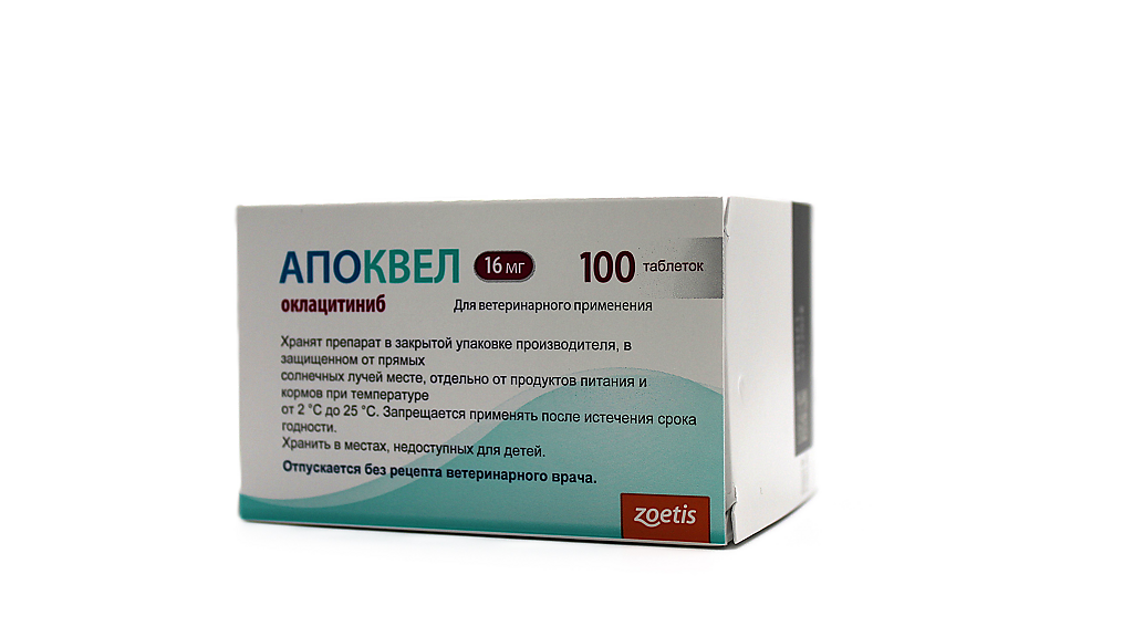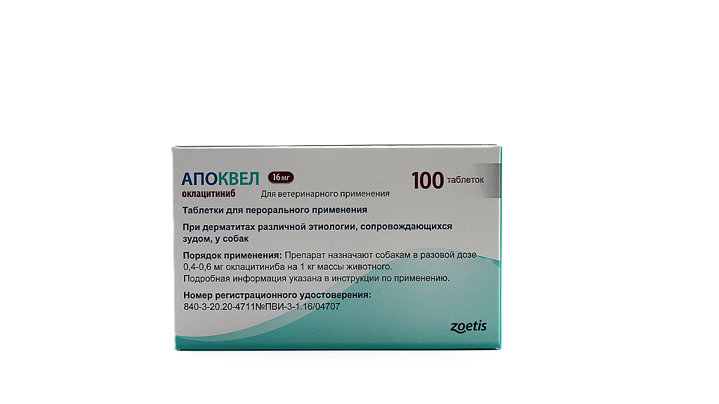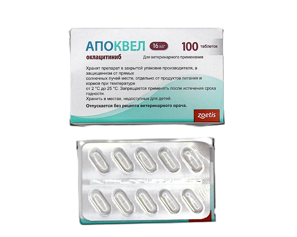 в 1 таблетке в качестве действующего вещества оклацитиниба малеат (в пересчете на оклацитиниб) 16 мг, а также вспомогательные вещества: микрокристаллическую целлюлозу, лактозы моногидрат, карбоксиметил-крахмал натрия, магния стеарат, плёнкообразователь «Opadry II White» и воду очищенную