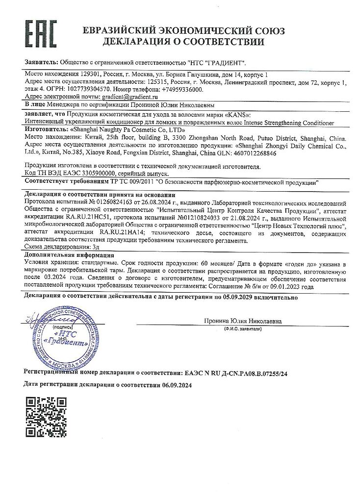 Документы KANS Интенсивный укрепляющий кондиционер для ломких и поврежденных волос Intense 200 г 1 шт
