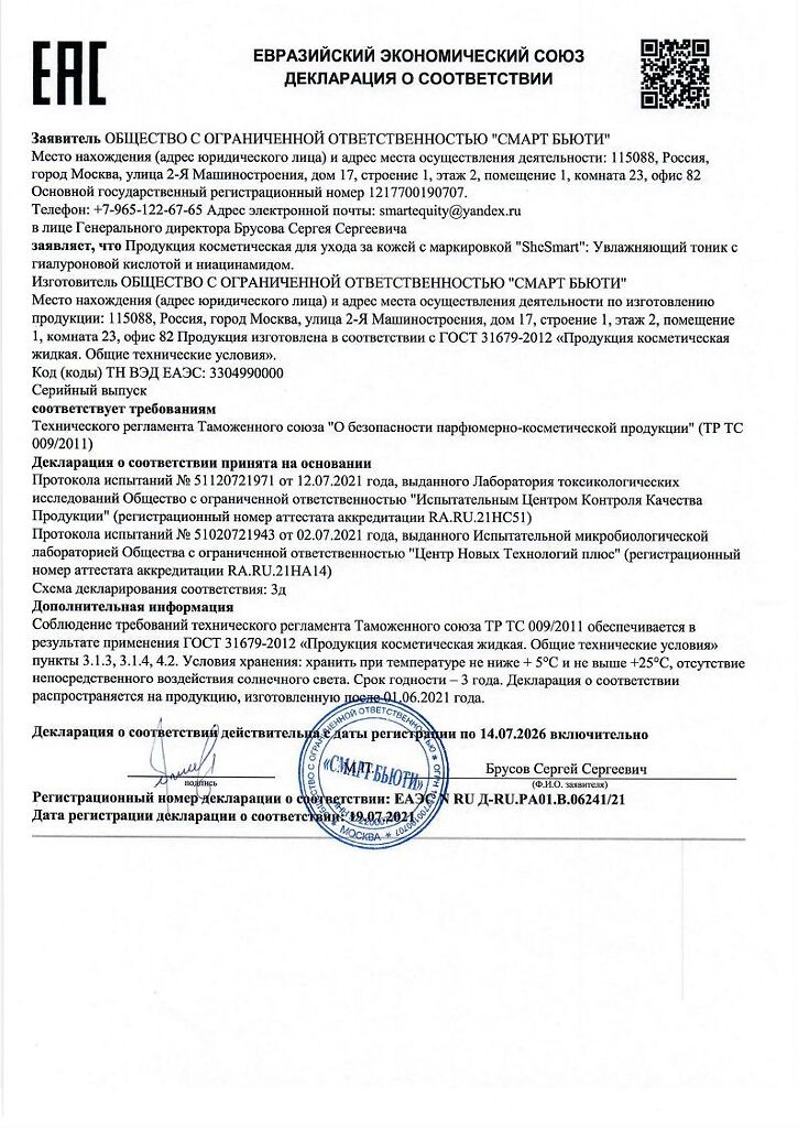 Документы SheSmart Тоник увлажняющий с гиалуроновой кислотой и ниацинамидом 200 мл 1 шт
