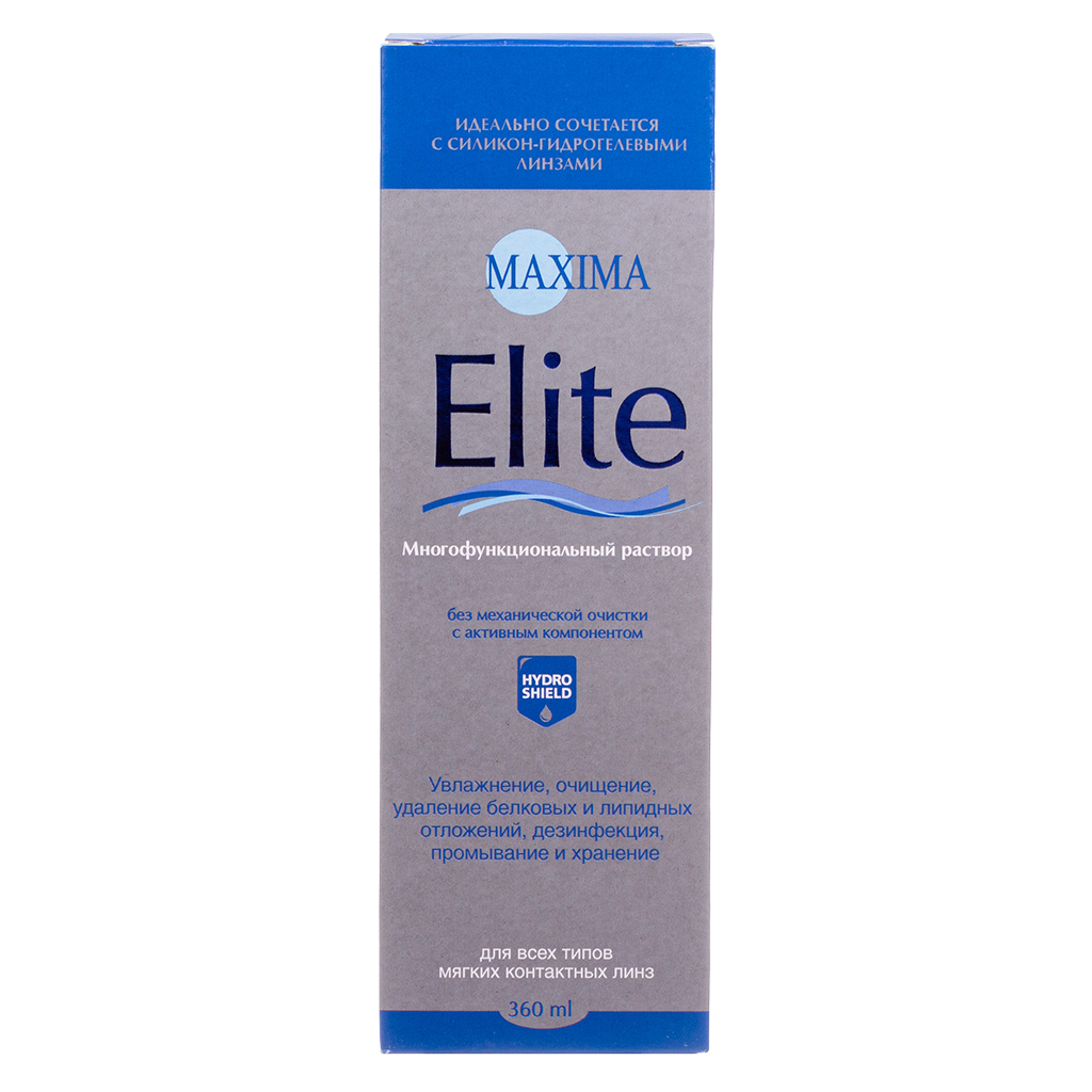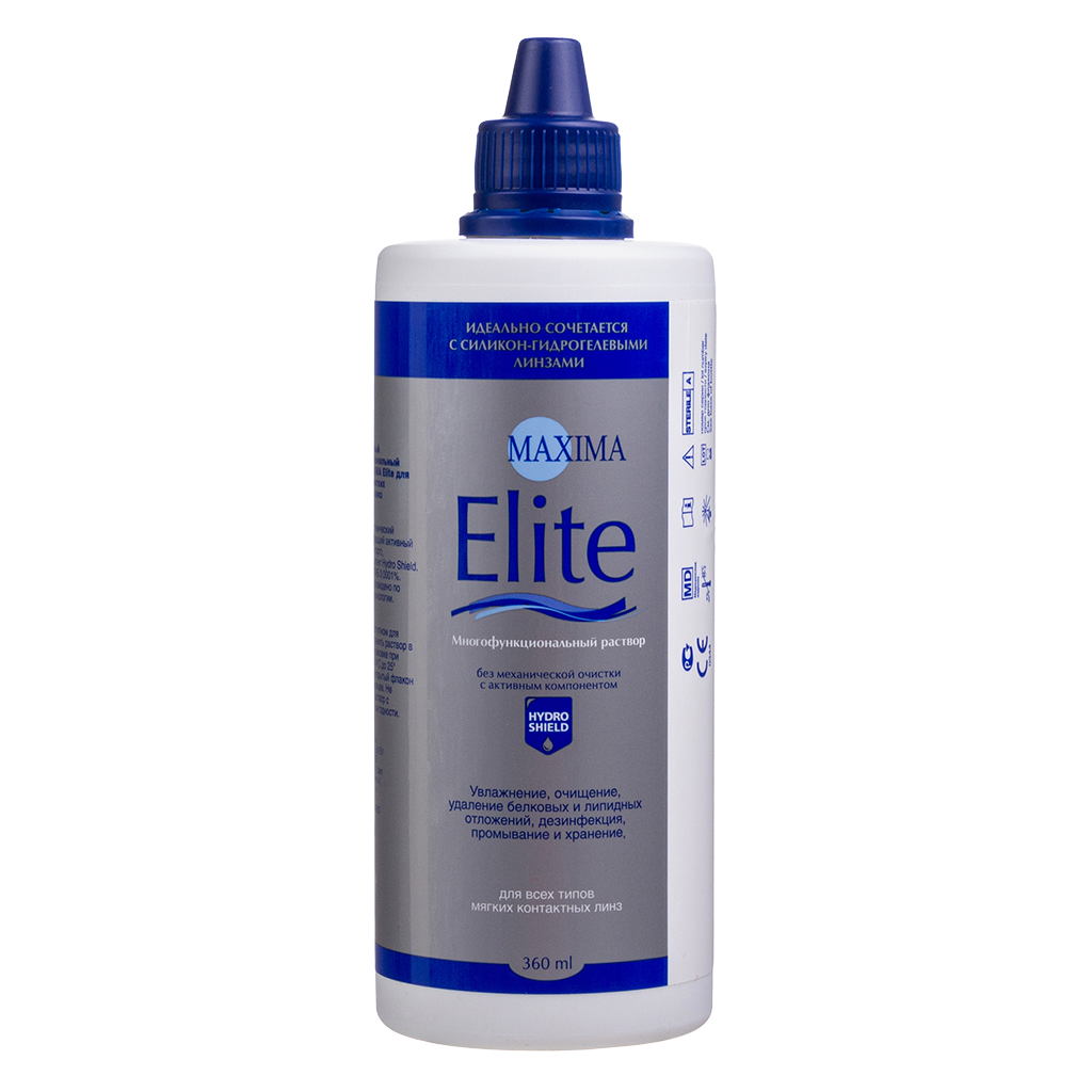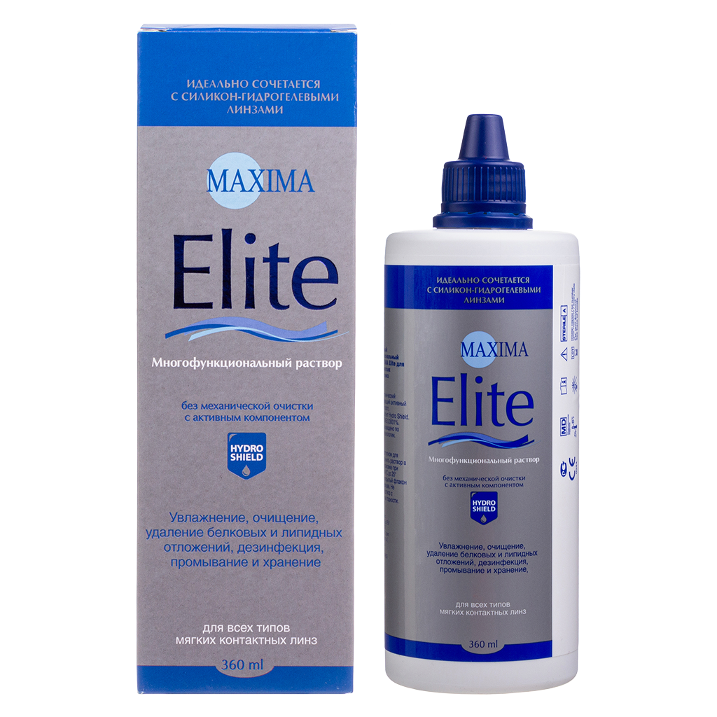 Многофункциональный раствор Maxima Elite удаляет белковые и липидные отложения с линзы.
