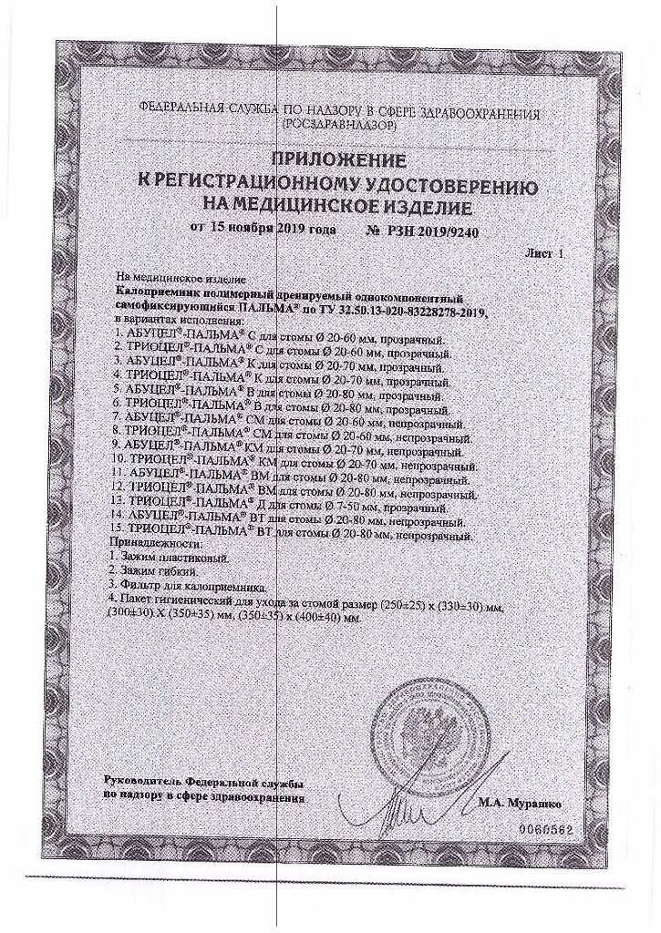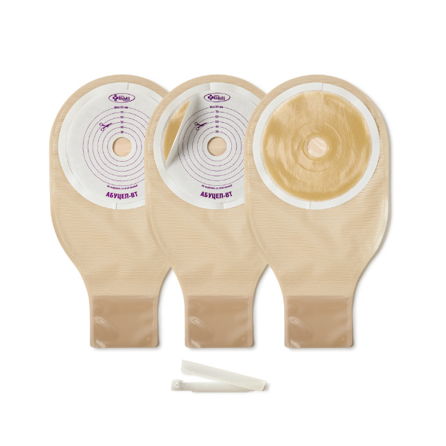 Калоприемники АБУЦЕЛ-ВТ выполнены из непрозрачной пленки телесного цвета с мягкой сетчатой подкладкой, прилегающей к коже. Запорный элемент - пластиковый, прилагается отдельно и рассчитан на несколько емкостей. Диаметр для стомы 20-80 мм.