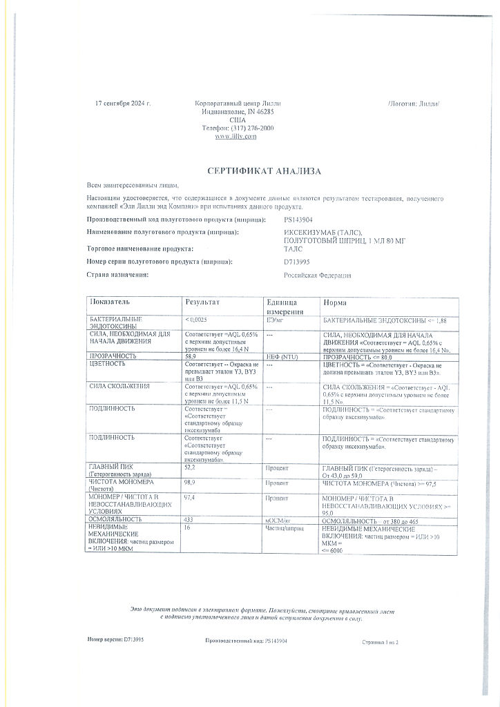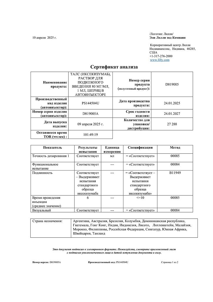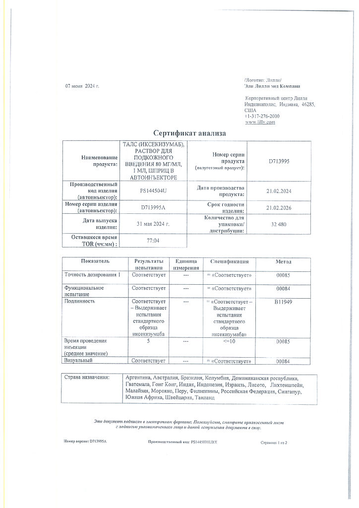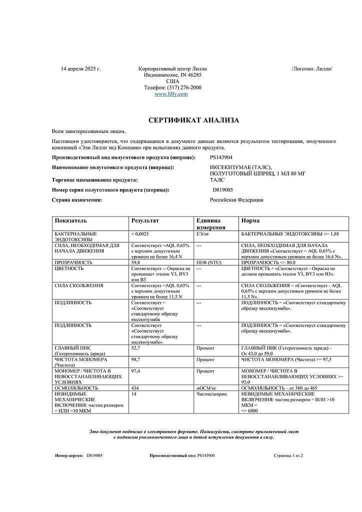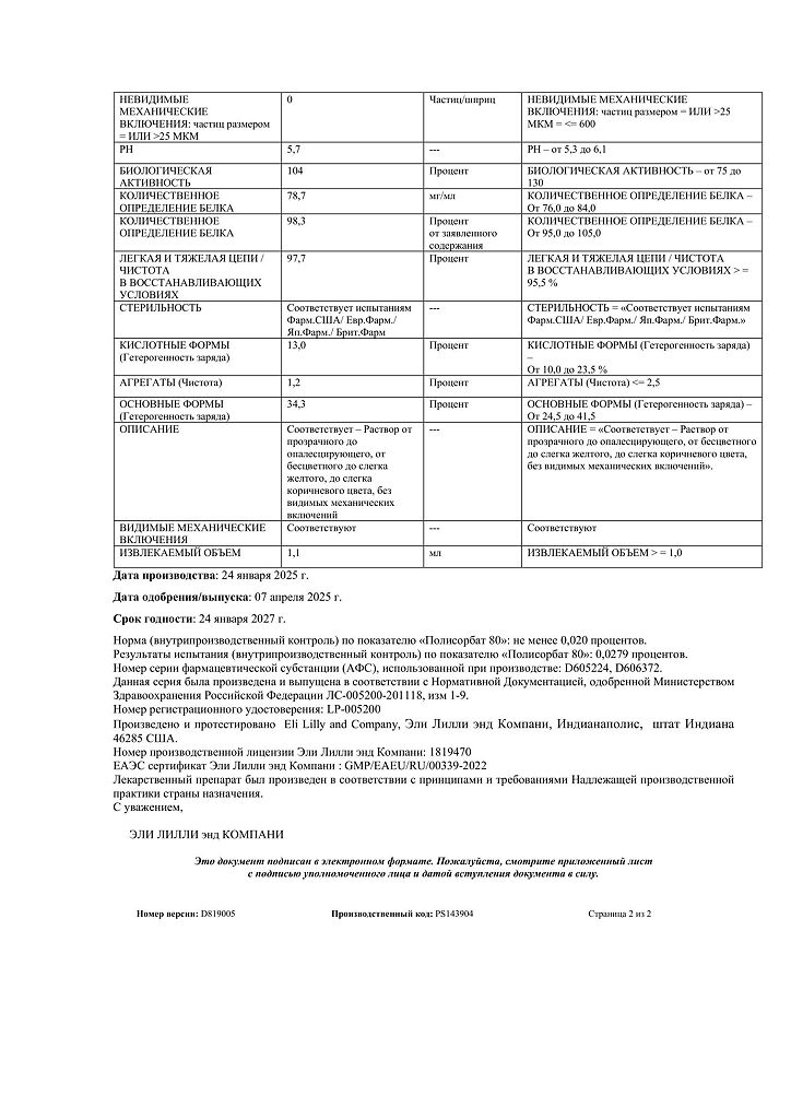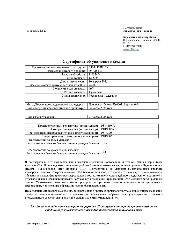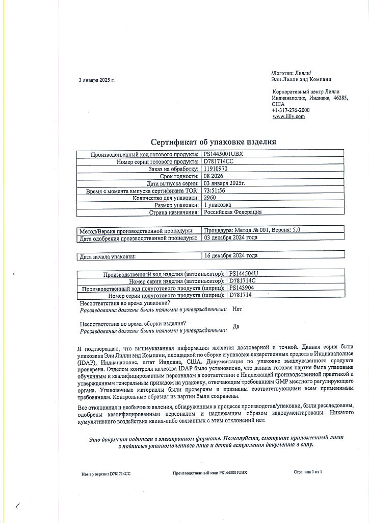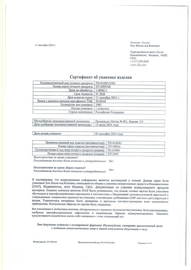 По 1 мл препарата в шприц из бесцветного стекла типа I с небольшим ободком, укупоренный с одной стороны резиновым плунжером, а с другой стороны снабженный иглой для инъекций 27G с защитным колпачком. Шприц встраивают в автоинъектор.