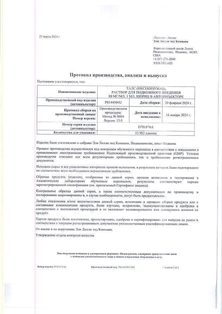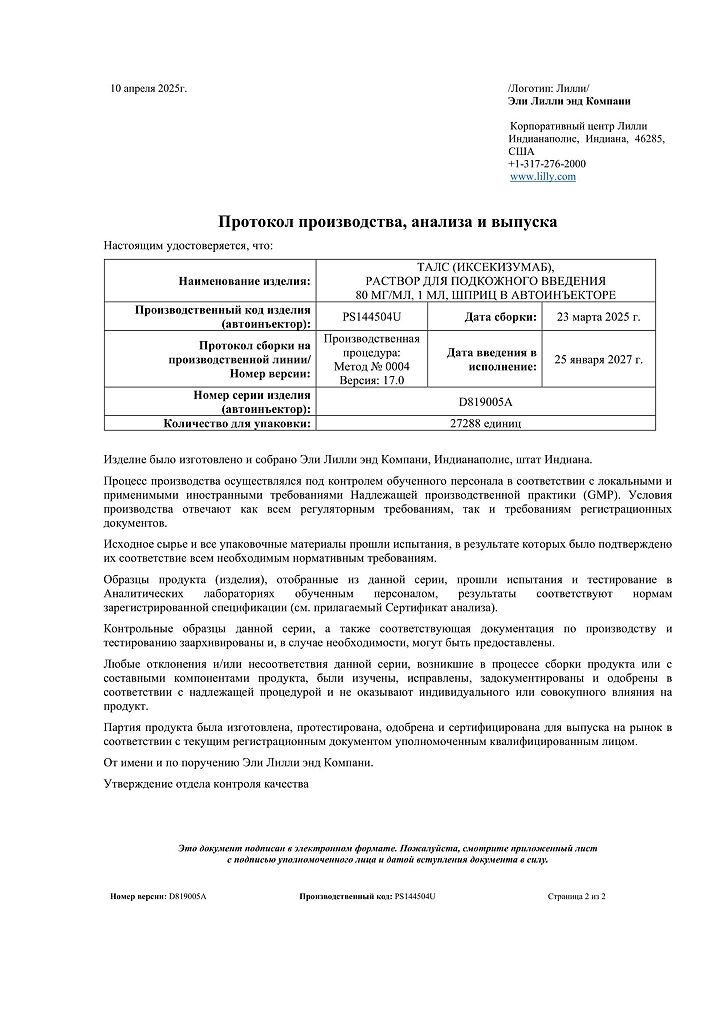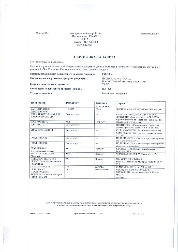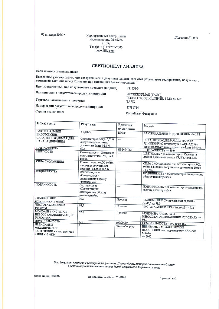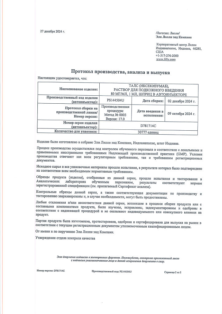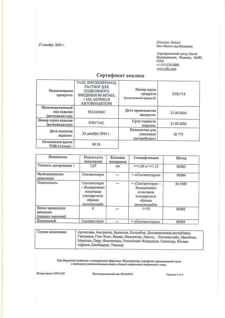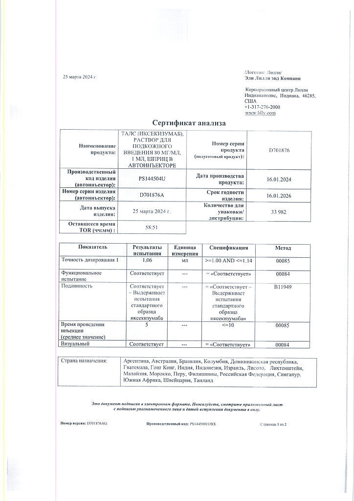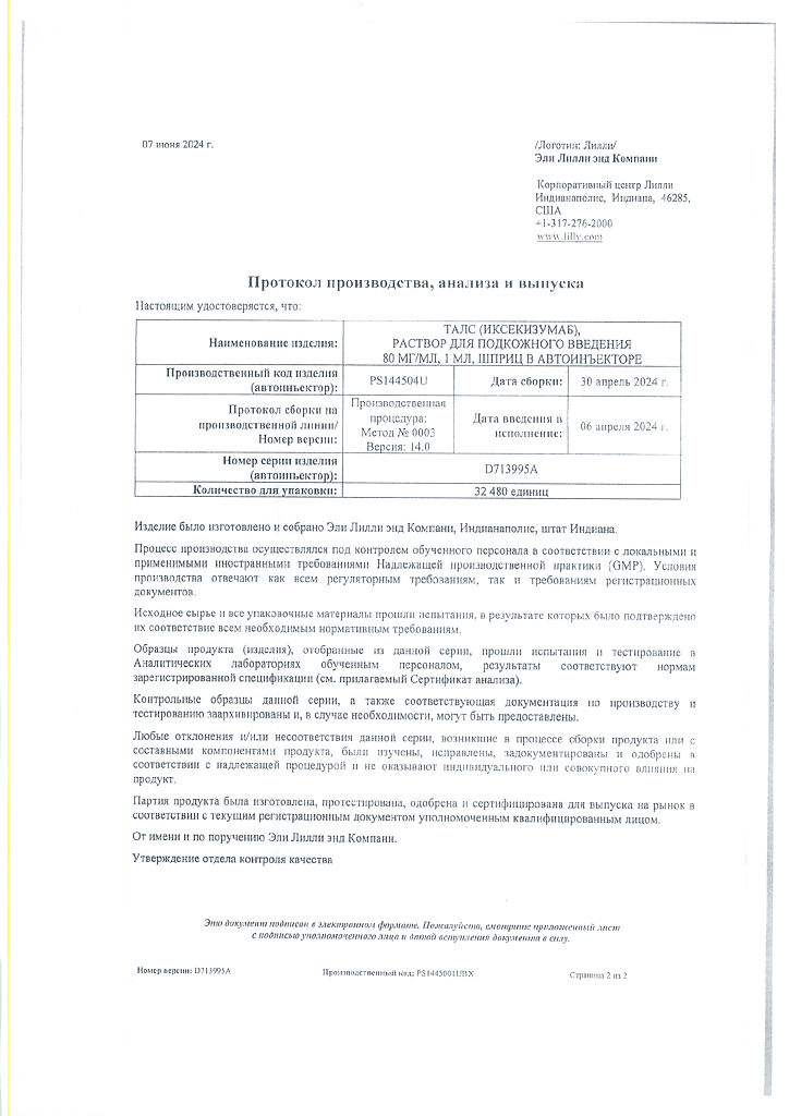По 1 мл препарата в шприц из бесцветного стекла типа I с небольшим ободком, укупоренный с одной стороны резиновым плунжером, а с другой стороны снабженный иглой для инъекций 27G с защитным колпачком. Шприц встраивают в автоинъектор.