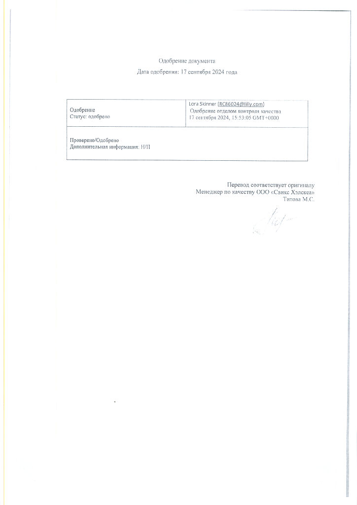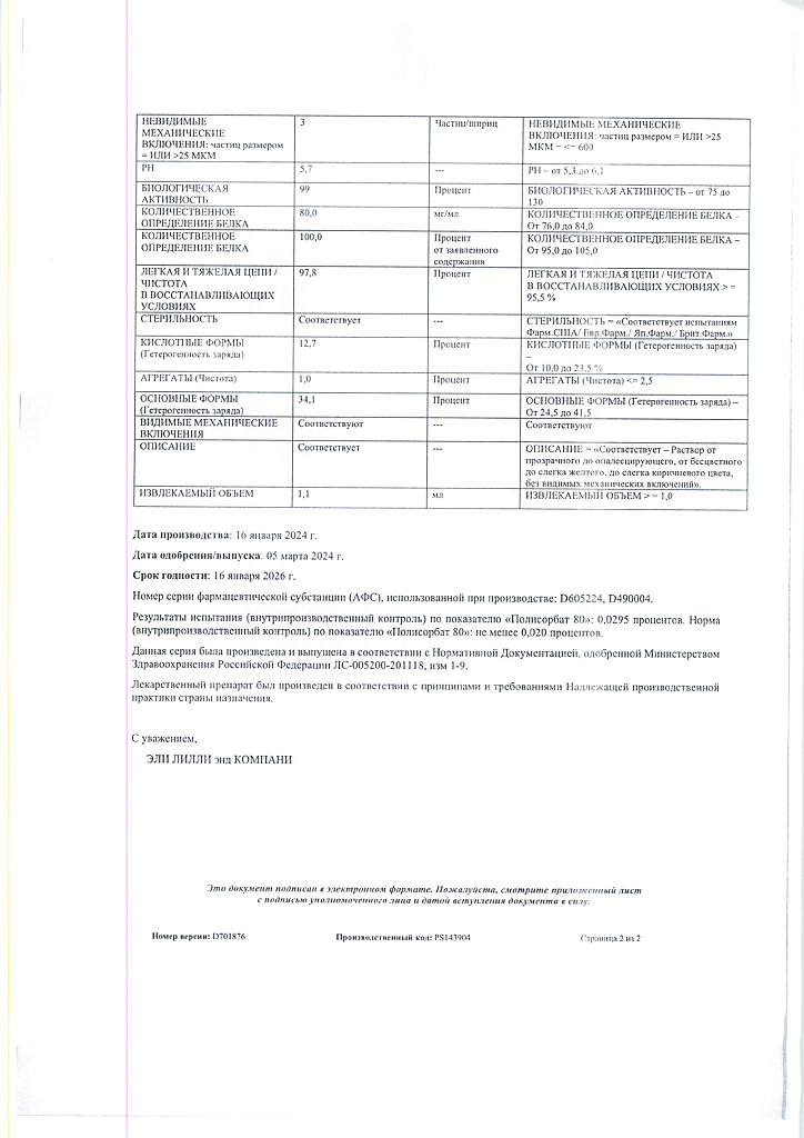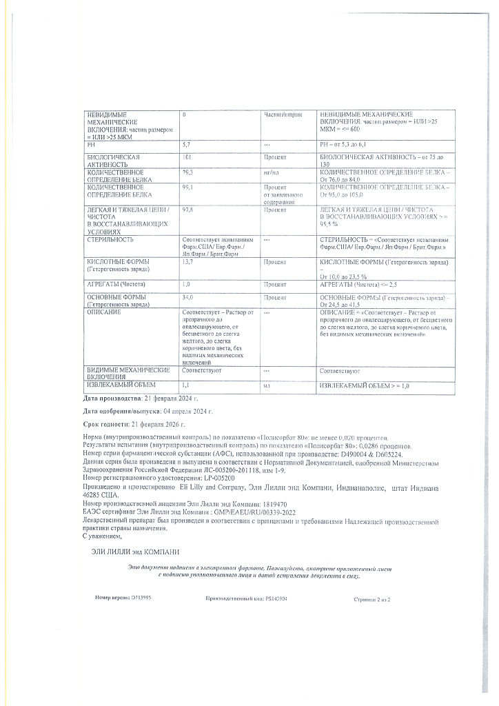 вспомогательные вещества: натрия цитрата дигидрат – 5,11 мг, лимонная кислота безводная – 0,51 мг, натрия хлорид – 11,69 мг, полисорбат 80 – 0,30 мг, вода для инъекций q.s. до 1 мл.