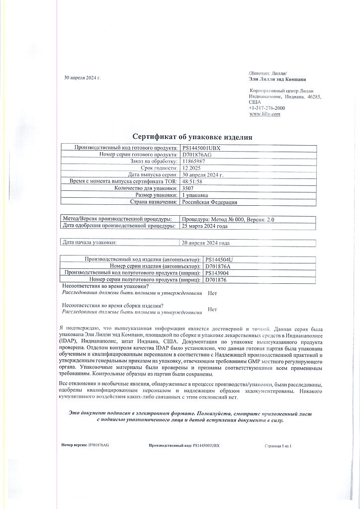 По 1, 2 или 3 автоинъектора вместе с инструкцией по применению препарата и руководством по использованию автоинъектора в пачке картонной.<