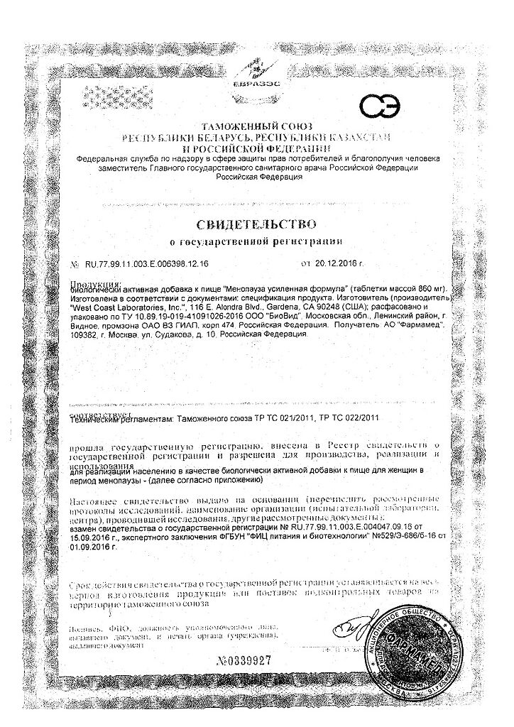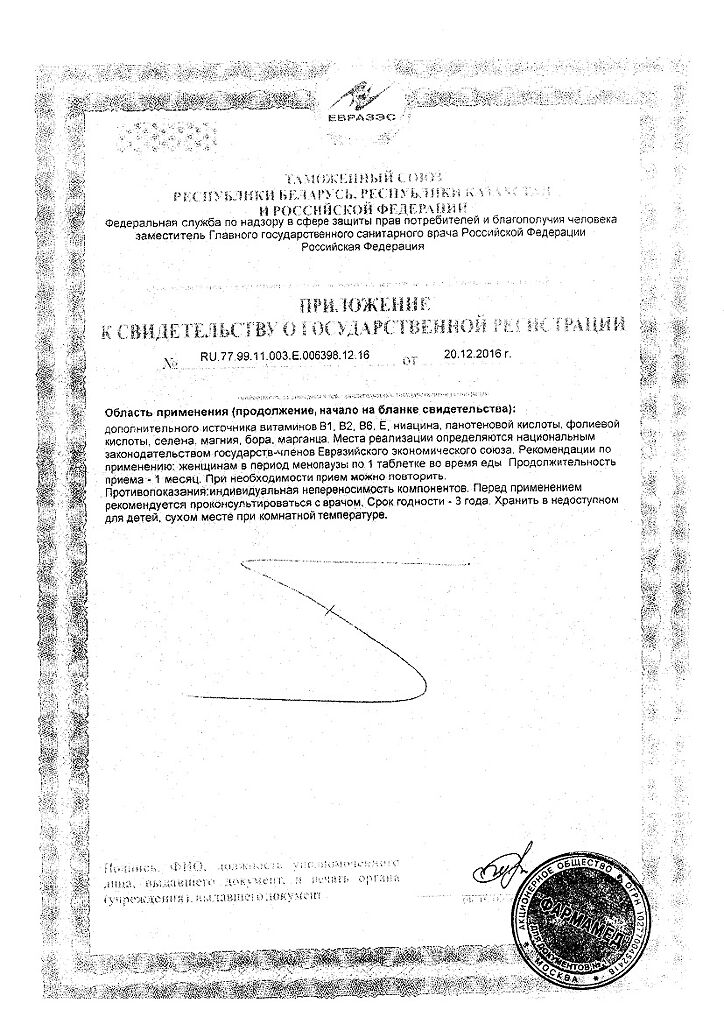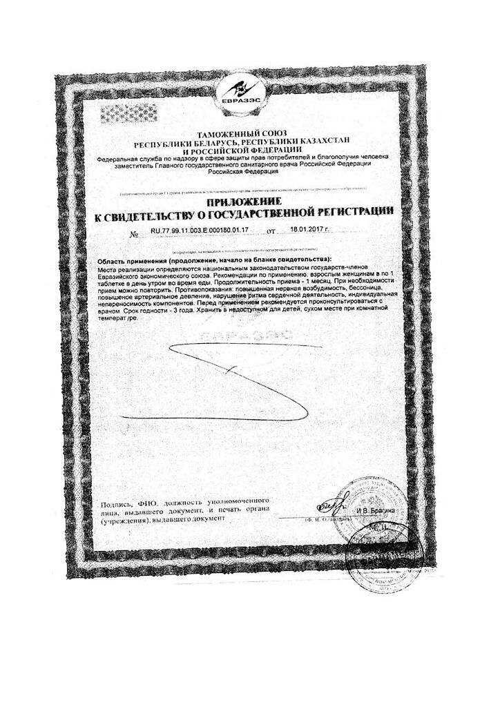 - Одна таблетка содержит - Экстракт зеленого чая 250 мг, Корень женьшеня настоящего 50 мг, Корень клопогона (цимицифуга) 20 мг.