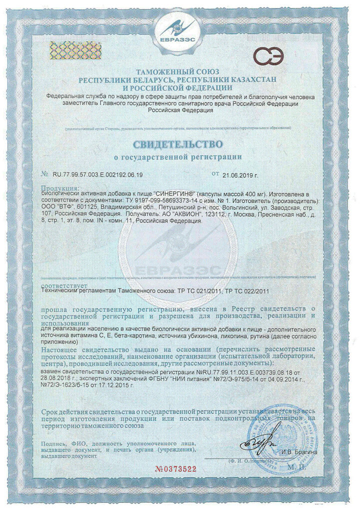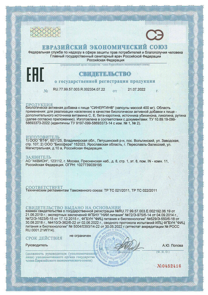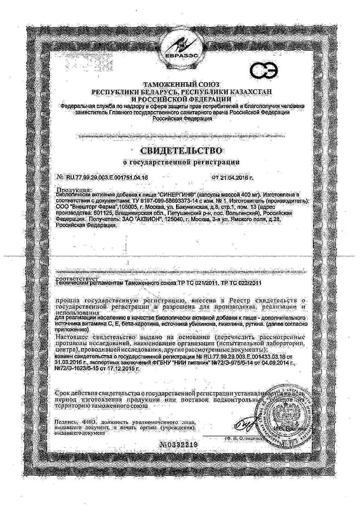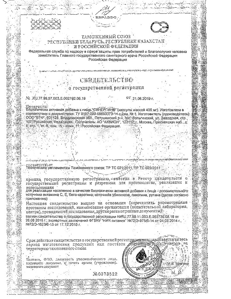 Синергин взрослым принимать по 1 капсуле один раз в день во время еды.