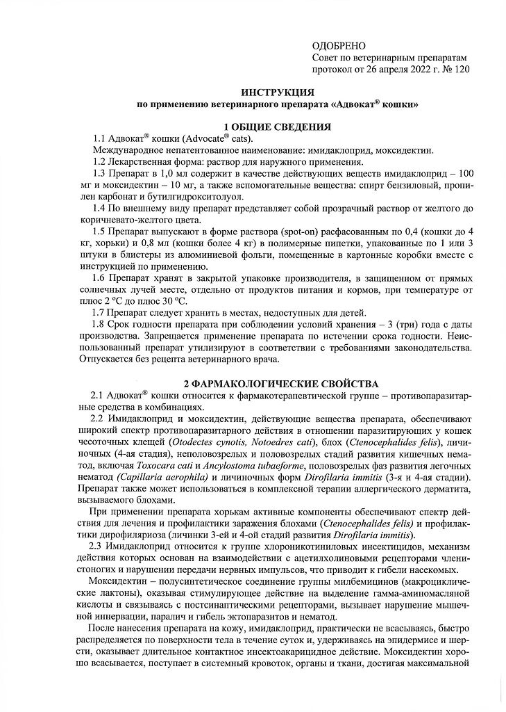 Адвокат® применяют собакам, кошкам и хорькам. Это препарат в виде капель на холку. Компонент препарата, который избавляет животных от блох, вшей, власоедов и клещей, распространяется по коже животного, а компонент препарата, который эффективен против гельминтов и чесоточных клещей, проникает через кожу в кровь животного.