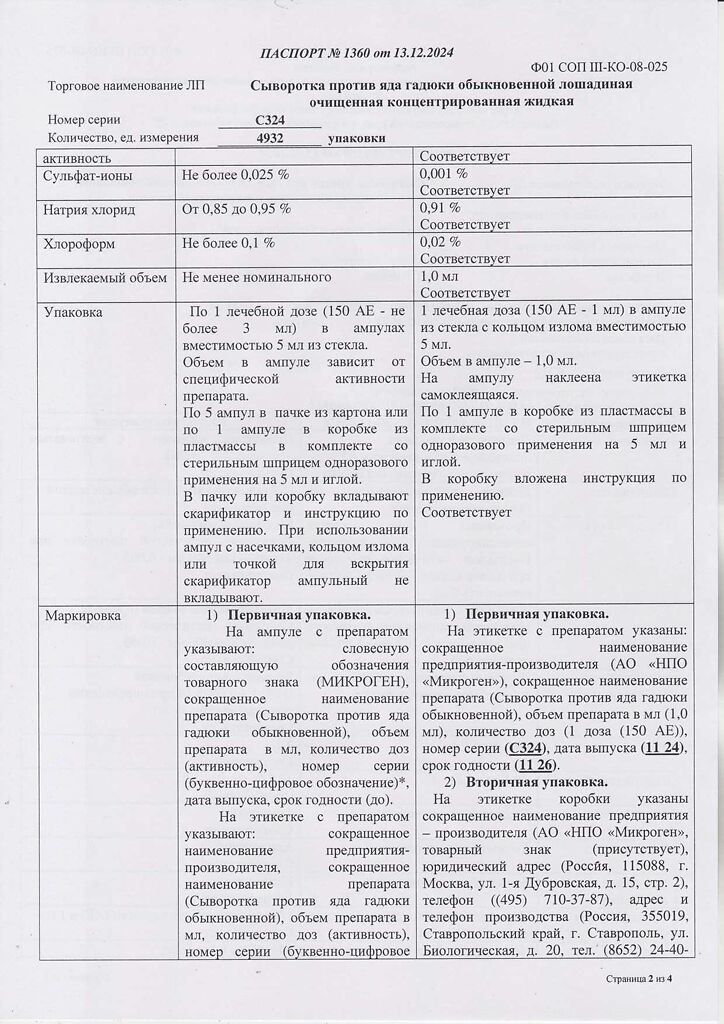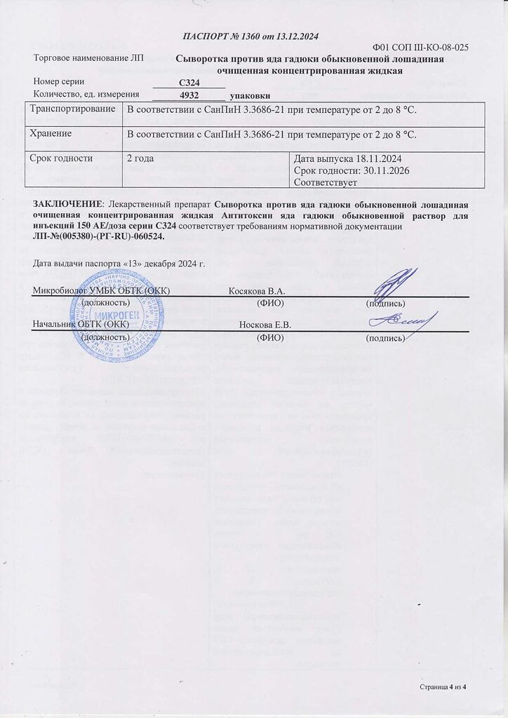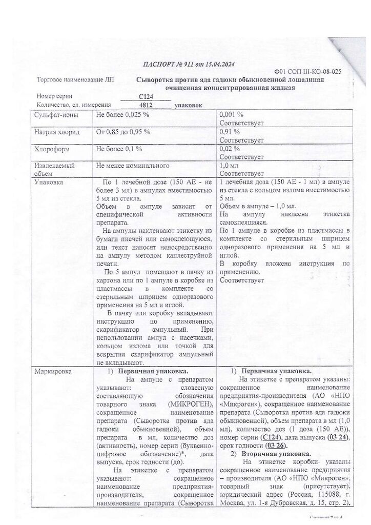 • Срок годности Сыворотка против яда гадюки обыкновенной - 2 года.