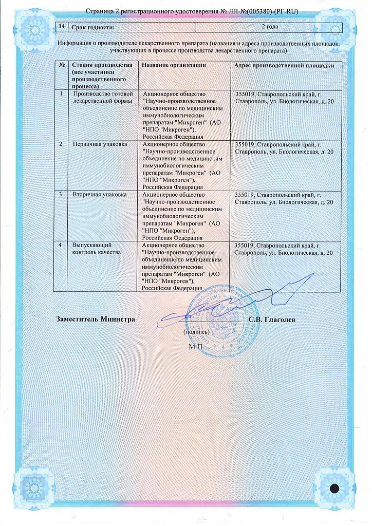 • Хранить и транспортировать в соответствии с СП. 3.3.2.1248-03 при температуре от 2° до 8°С.Хранить в недоступном для детей месте.
