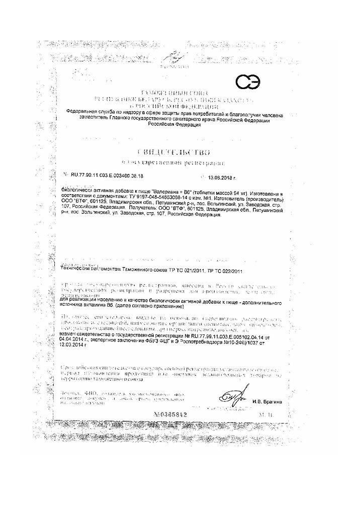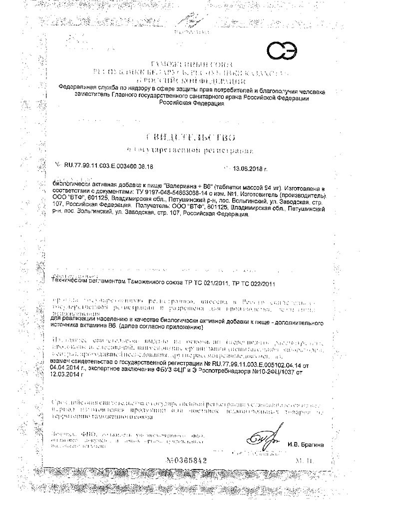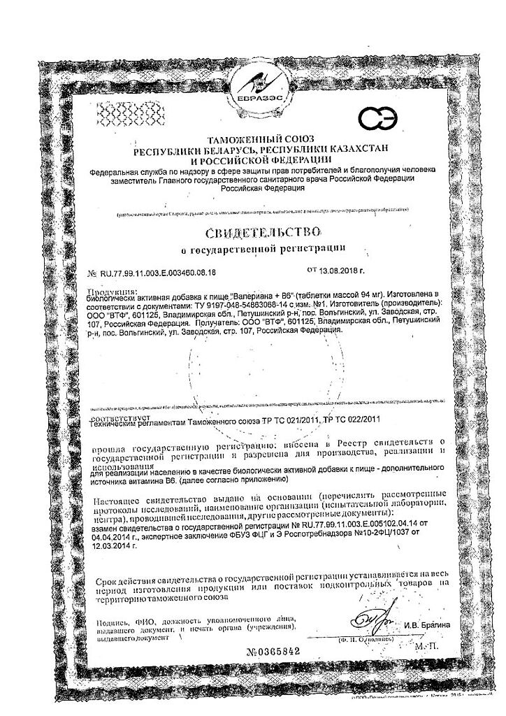 Документы Валериана+В6 таблетки массой 94 мг 50 шт
