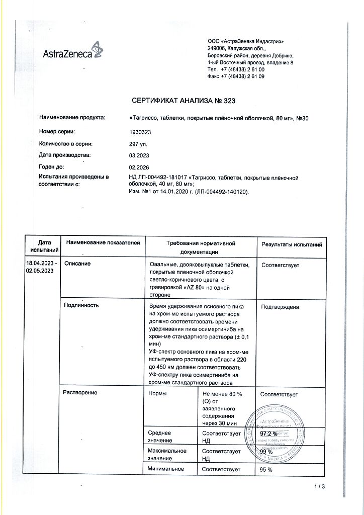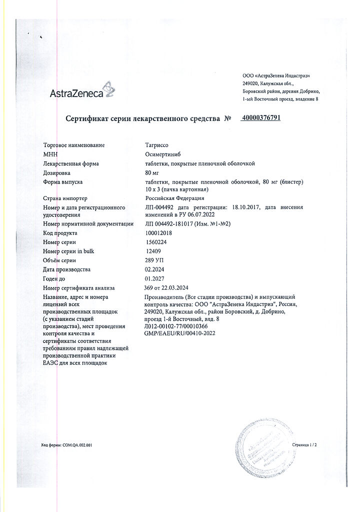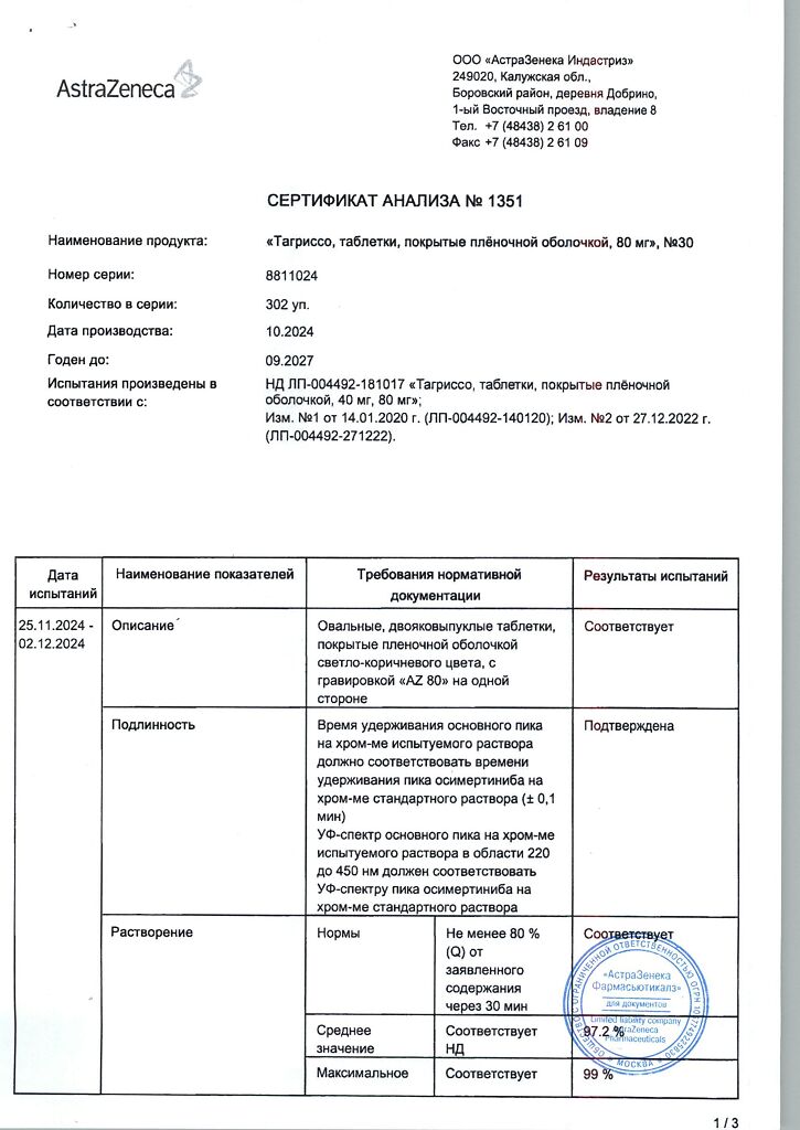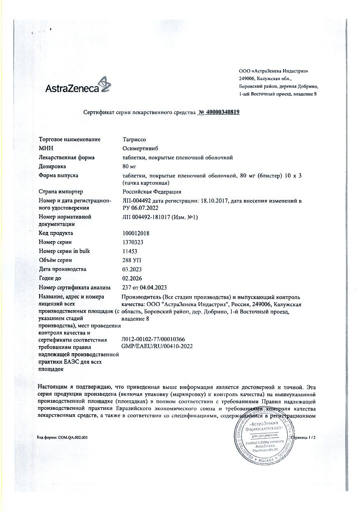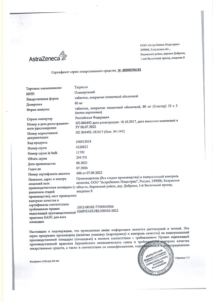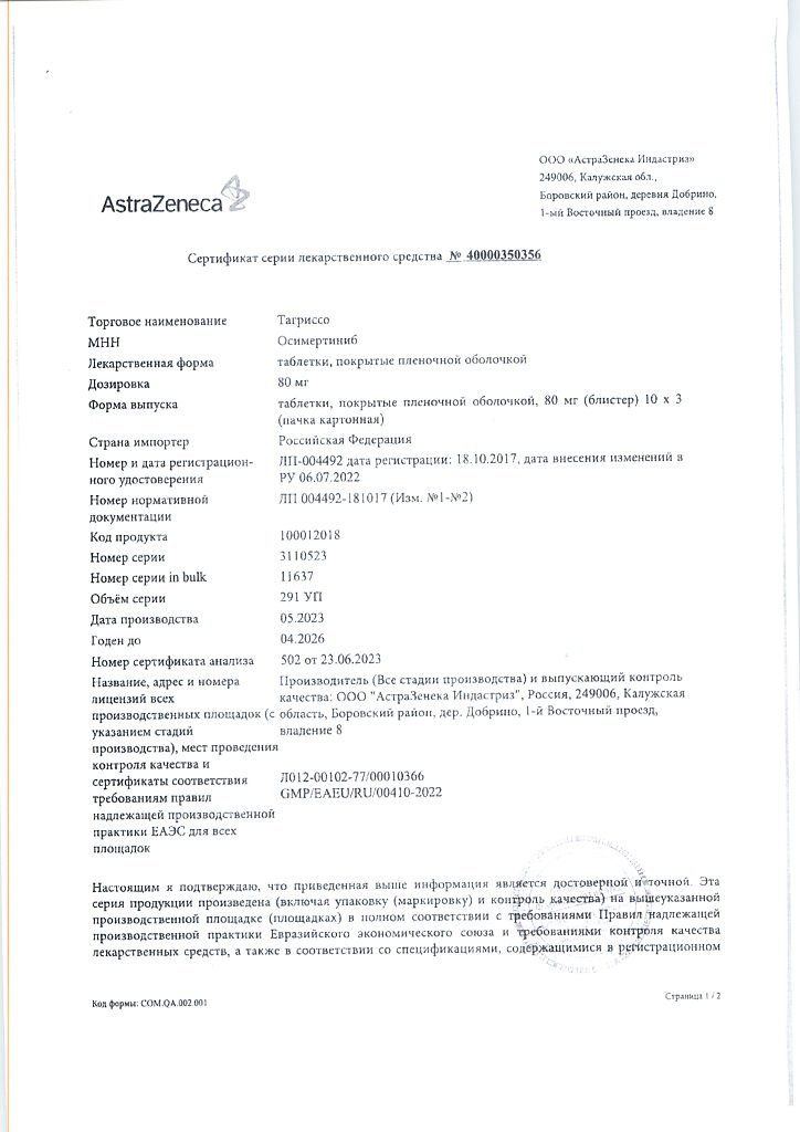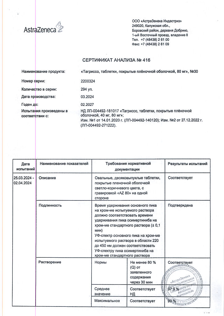 До назначения препарата Тагриссо следует подтвердить статус мутации в гене EGFR с помощью валидированного теста: