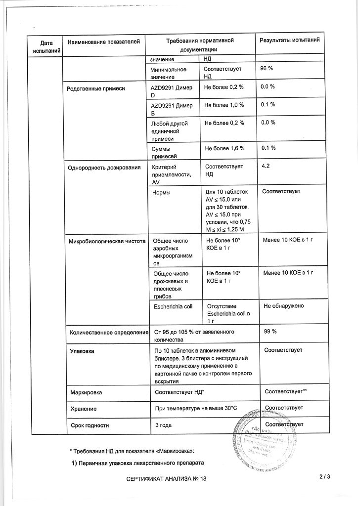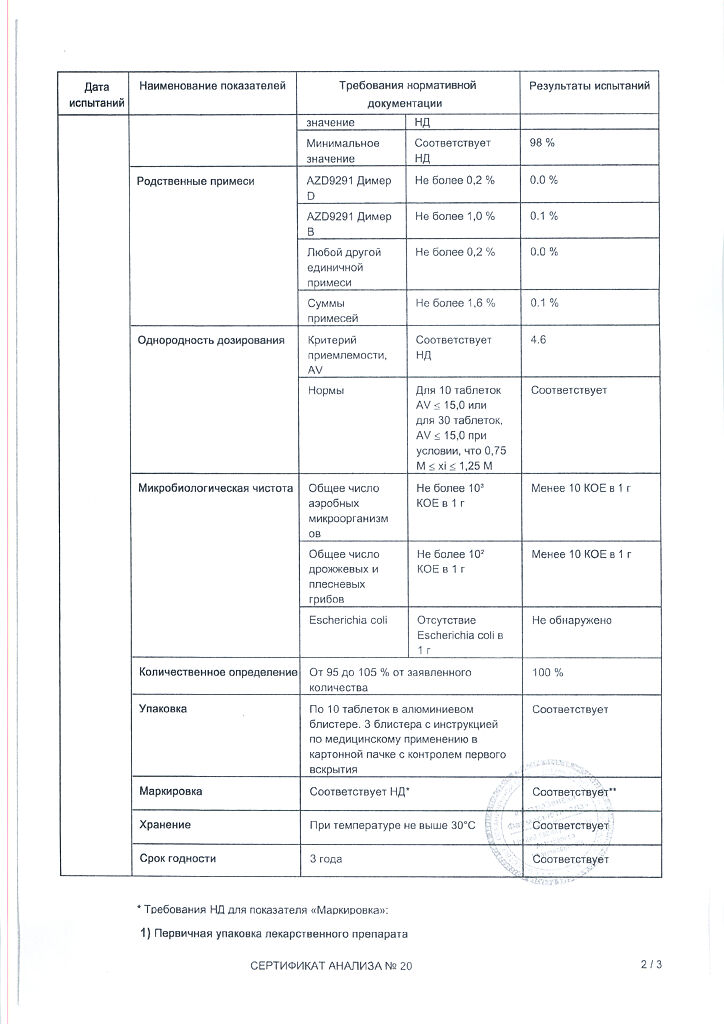 Параметры фармакокинетики осимертиниба определялись у здоровых добровольцев и пациентов с НМРЛ. По результатам анализа популяционной фармакокинетики кажущийся плазменный клиренс осимертиниба составляет 14.3 л/ч, кажущийся Vd 918 л и T1/2 примерно 44 ч. Значения AUC и Cmax увеличивались пропорционально принятой дозе в диапазоне доз от 20 до 240 мг. Прием осимертиниба 1 раз/сут каждый день приводит к приблизительно 3-кратному накоплению с достижением равновесного состояния к 15 дню приема. В равновесном состоянии плазменные концентрации обычно поддерживались в 1.6-кратном диапазоне в течение 24-часового междозового интервала.