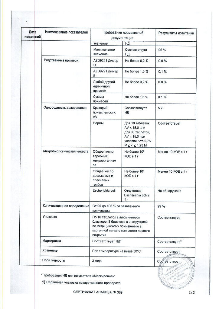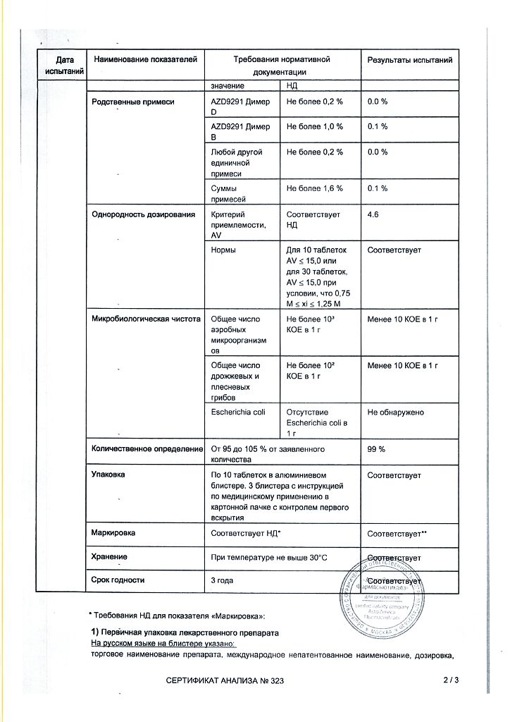 По возможности, следует избегать применения осимертиниба у пациентов с врожденным синдромом удлиненного интервала QT. Пациентам с хронической сердечной недостаточностью, нарушениями электролитного состава и пациентам, принимающим препараты, удлиняющие интервал QTc, следует периодически выполнять ЭКГ и определять концентрацию электролитов. Терапию необходимо приостановить у пациентов со значениями интервала QTc выше 500 мсек, выявленными хотя бы двукратно при повторных регистрациях ЭКГ, до уменьшения длительности интервала QTc менее 481 мсек или до исходного значения (если исходная длительность интервала QTc была не менее 481 мсек), а затем возобновить терапию с уменьшенной дозы препарата (см. Таблицу 1). Если на фоне удлинения интервала QT развивается желудочковая тахикардия по типу "пируэт", полиморфная желудочковая тахикардия или признаки/симптомы тяжелого нарушения ритма сердца, терапию осимертинибом следует отменить.