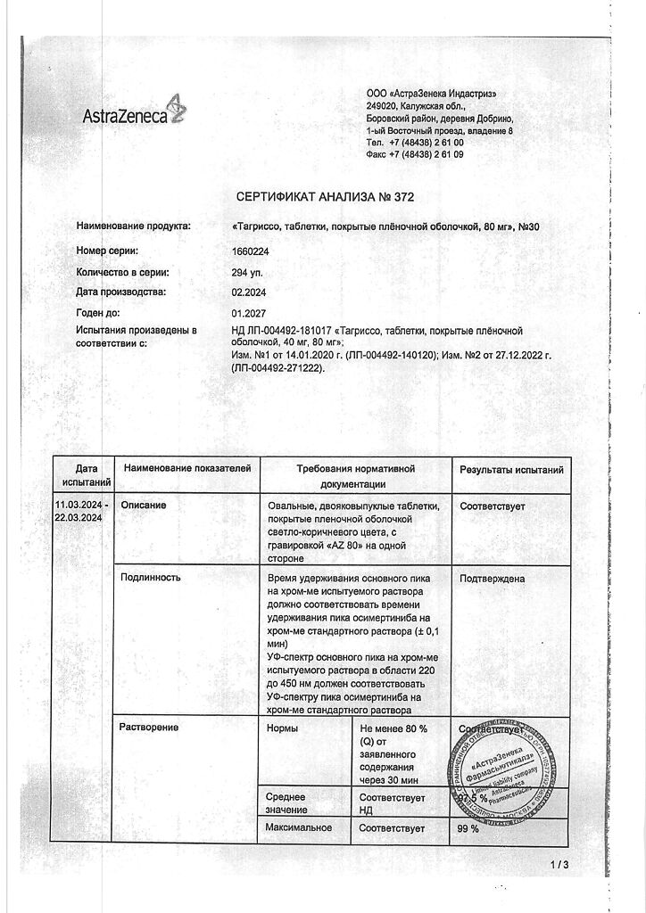 После приема внутрь медиана Tmax осимертиниба в плазме составляет 6 (3-24) ч, а у некоторых пациентов Cmax достигались в течение первых 24 ч. Абсолютная биодоступность препарата Тагриссо составляет 70% (90% доверительный интервал (ДИ) 67-73). Согласно данным клинического фармакокинетического исследования у пациентов, получавших препарат в дозе 80 мг, прием пищи не оказывает клинически значимого влияния на биодоступность осимертиниба (AUC повышается на 6% (90% ДИ: 5-19), а Cmax понижается на 7% (90% ДИ: 19-6)). У здоровых добровольцев повышение рН желудочного сока за счет приема омепразола в течение 5 дней не влияло на экспозицию осимертиниба, принятого в форме таблетки 80 мг (AUC и Cmax увеличились на 7% и 2%, соответственно), а 90% ДИ для соотношения экспозиций укладывался в границы 80-125%.